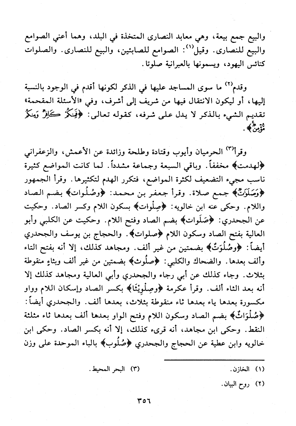 وقرأ (¬3) الحرميان وأيوب وقتادة وطلحة وزائدة عن الأعمش، والزعفراني {لهدمت} مخففًا. وباقي السبعة وجماعة مشددًا. لما كانت المواضع كثيرة ناسب مجيء التضعيف لكثرة المواضع، فتكرر الهدم لتكثيرها. وقرأ الجمهور {وَصَلَوَاتٌ} جمع صلاة. وقرأ جعفر بن محمد: {وصُلُوات} بضم الصاد واللام. وحكى عنه ابن خالويه: {صِلْوات} بسكون اللام وكسر الصاد. وحكيت عن الجحدري: {صَلَوات} بضم الصاد وفتح اللام. وحكيت عن الكلبي وأبو العالية بفتح الصاد وسكون اللام {صلوات}. والحجاج بن يوسف والجحدري أيضًا: {وصُلُوَتٌ} بضمتين من غير ألف، ومجاهد كذلك، إلا أنه بفتح التاء وألف بعدها. والضحاك والكلبي: {صلُوث} بضمتين من غير ألف وبثاءٍ منقوطة بثلاث. وجاء كذلك عن أبي رجاء والجحدري وأبي العالية ومجاهد كذلك إلا أنه بعد الثاء ألف. وقرأ عكرمة {وصِلْوِيْثَا} بكسر الصاد وإسكان اللام وواو مكسورة بعدها ياء بعدها ثاء منقوطة بثلاث، بعدها ألف. والجحدري أيضًا: {صُلْوَاثٌ} بضم الصاد وسكون اللام وفتح الواو بعدها ألف بعدها ثاء مثلثة النقط. وحكى ابن مجاهد، أنه قرىء كذلك، إلا أنه بكسر الصاد. وحكى ابن خالويه وابن عطية عن الحجاج والجحدري {صُلُوب} بالباء الموحدة على وزن