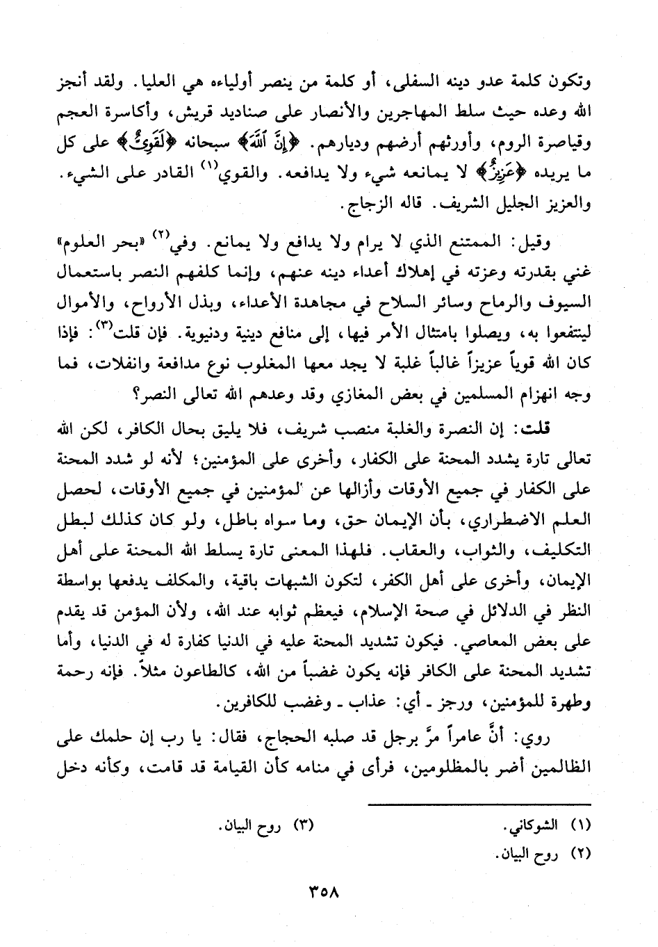 وقيل: الممتنع الذي لا يرام ولا يدافع ولا يمانع. وفي (¬2) "بحر العلوم" غني بقدرته وعزته في إهلاك أعداء دينه عنهم، وإنما كلفهم النصر باستعمال السيوف والرماح وسائر السلاح في مجاهدة الأعداء، وبذل الأرواح، والأموال لينتفعوا به، ويصلوا بامتثال الأمر فيها، إلى منافع دينية ودنيوية. فإن قلت (¬3): فإذا كان الله قوياً عزيزًا غالبًا غلبة لا يجد معها المغلوب نوع مدافعة وانفلات، فما وجه انهزام المسلمين في بعض المغازي وقد وعدهم الله تعالى النصر؟