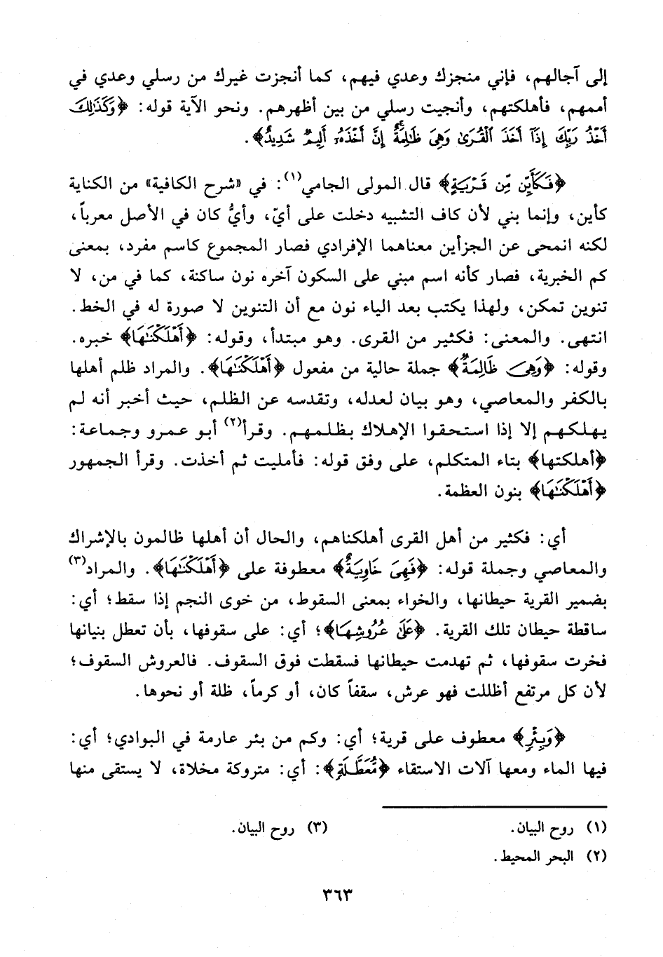 45 - {فَكَأَيِّنْ مِنْ قَرْيَةٍ} قال. المولى الجامي (¬1): في "شرح الكافية" من الكناية كأين، وإنما بني لأن كاف التشبيه دخلت على أيّ، وأيُّ كان في الأصل معربًا، لكنه انمحى عن الجزأين معناهما الإفرادي فصار المجموع كاسم مفرد، بمعنى كم الخبرية، فصار كأنه اسم مبني على السكون آخره نون ساكنة، كما في من، لا تنوين تمكن، ولهذا يكتب بعد الياء نون مع أن التنوين لا صورة له في الخط. انتهى. والمعنى: فكثير من القرى. وهو مبتدأ، وقوله: {أَهْلَكْنَاهَا} خبره. وقوله: {وَهِيَ ظَالِمَةٌ} جملة حالية من مفعول {أَهْلَكْنَاهَا}. والمراد ظلم أهلها بالكفر والمعاصي، وهو بيان لعدله، وتقدسه عن الظلم، حيث أخبر أنه لم يهلكهم إلا إذا استحقوا الإهلاك بظلمهم. وقرأ (¬2) أبو عمرو وجماعة: {أهلكتها} بتاء المتكلم، على وفق قوله: فأمليت ثم أخذت. وقرأ الجمهور {أَهْلَكْنَاهَا} بنون العظمة.
