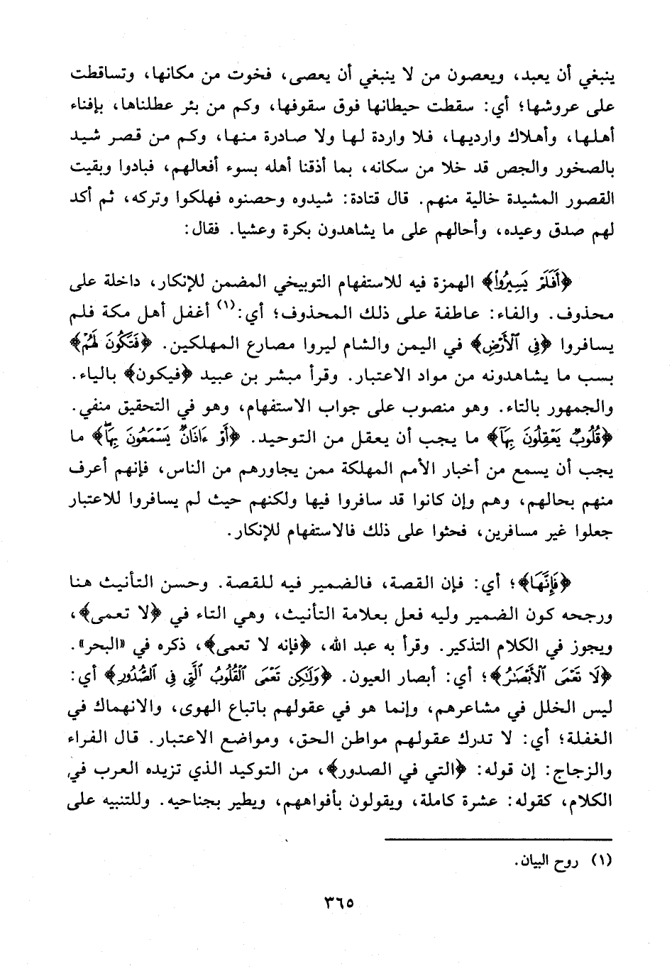 {أَفَلَمْ يَسِيرُوا} الهمزة فيه للاستفهام التوبيخي المضمن للإنكار، داخلة على محذوف. والفاء: عاطفة على ذلك المحذوف؛ أي: (¬1) أغفل أهل مكة فلم يسافروا {فِي الْأَرْضِ} في اليمن والشام ليروا مصارع المهلكين. {فَتَكُونَ لَهُمْ} بسب ما يشاهدونه من مواد الاعتبار. وقرأ مبشر بن عبيد {فيكون} بالياء. والجمهور بالتاء. وهو منصوب على جواب الاستفهام، وهو في التحقيق منفي. {قُلُوبٌ يَعْقِلُونَ بِهَا} ما يجب أن يعقل من التوحيد. {أَوْ آذَانٌ يَسْمَعُونَ بِهَا} ما يجب أن يسمع من أخبار الأمم المهلكة ممن يجاورهم من الناس، فإنهم أعرف منهم بحالهم، وهم وإن كانوا قد سافروا فيها ولكنهم حيث لم يسافروا للاعتبار جعلوا غير مسافرين، فحثوا على ذلك فالاستفهام للإنكار.