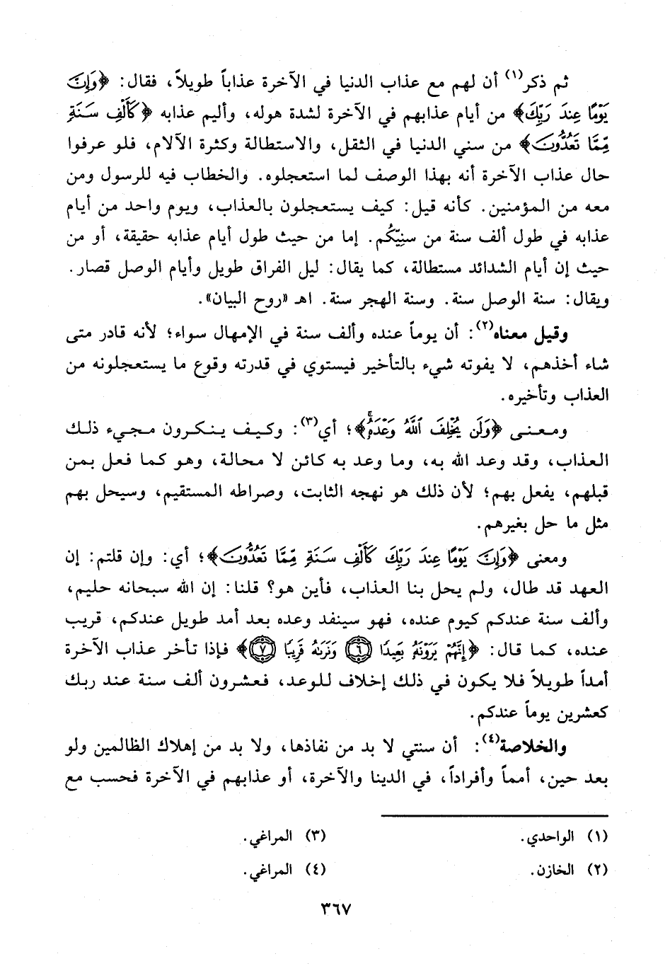 ومعنى {وَإِنَّ يَوْمًا عِنْدَ رَبِّكَ كَأَلْفِ سَنَةٍ مِمَّا تَعُدُّونَ}؛ أي: وإن قلتم: إن العهد قد طال، ولم يحل بنا العذاب، فأين هو؟ قلنا: إن الله سبحانه حليم، وألف سنة عندكم كيوم عنده، فهو سينفد وعده بعد أمد طويل عندكم، قريب عنده، كما قال: {إِنَّهُمْ يَرَوْنَهُ بَعِيدًا (6) وَنَرَاهُ قَرِيبًا (7)} فإذا تأخر عذاب الآخرة أمدًا طويلًا فلا يكون في ذلك إخلاف للوعد، فعشرون ألف سنة عند ربك كعشرين يومًا عندكم.