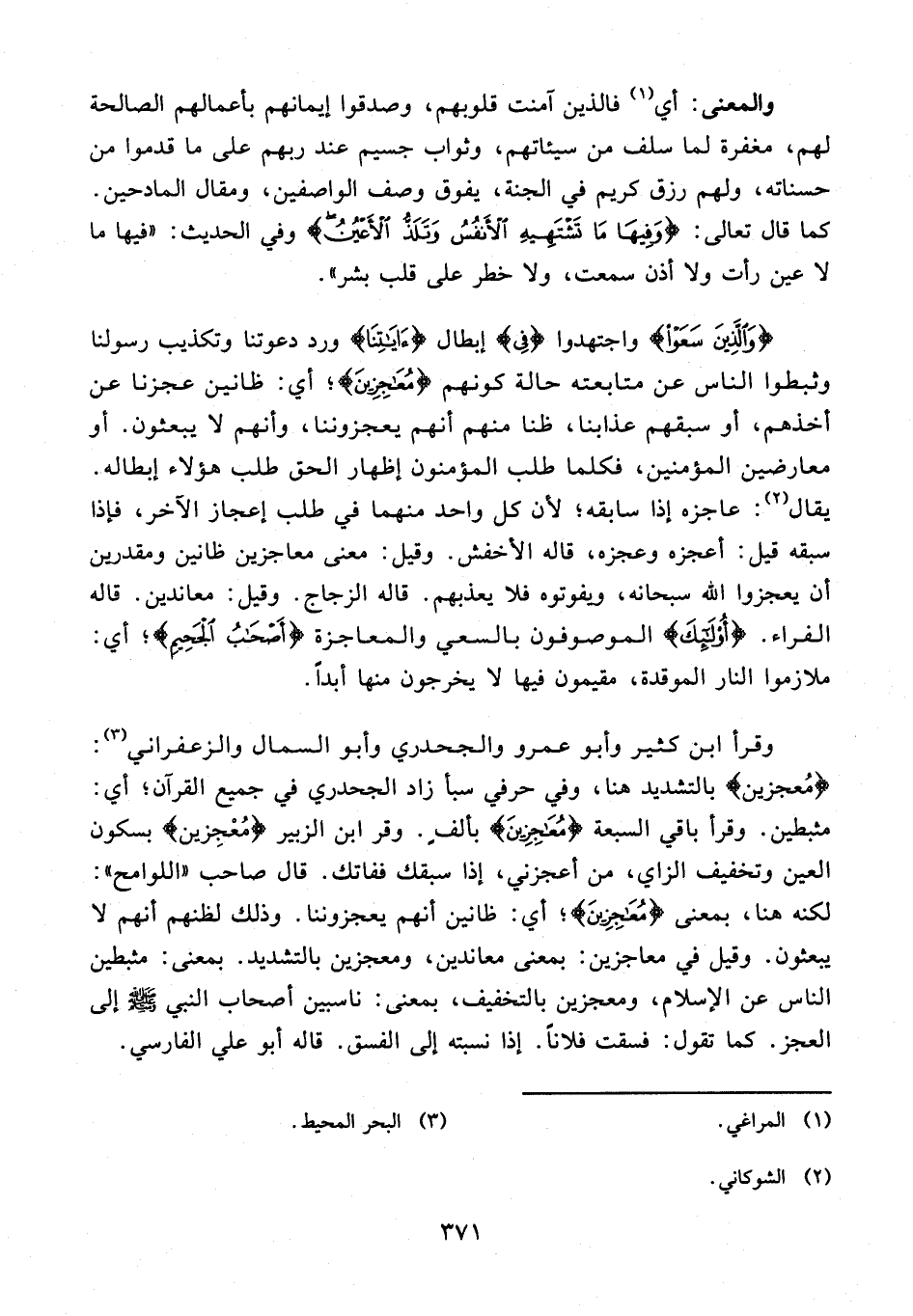وقرأ ابن كثير وأبو عمرو والجحدري وأبو السمال والزعفراني (¬3): {مُعجزين} بالتشديد هنا، وفي حرفي سبأ زاد الجحدري في جميع القرآن؛ أي: مثبطين. وقرأ باقي السبعة {مُعَاجِزِينَ} بألفٍ. وقرأ ابن الزبير {مُعْجِزين} بسكون العين وتخفيف الزاي، من أعجزني، إذا سبقك ففاتك. قال صاحب "اللوامح": لكنه هنا، بمعنى {مُعَاجِزِينَ}؛ أي: ظانين أنهم يعجزوننا. وذلك لظنهم أنهم لا يبعثون. وقيل في معاجزين: بمعنى معاندين، ومعجزين بالتشديد. بمعنى: مثبطين الناس عن الإسلام، ومعجزين بالتخفيف، بمعنى: ناسبين أصحاب النبي - صلى الله عليه وسلم - إلى العجز. كما تقول: فسقت فلانًا. إذا نسبته إلى الفسق. قاله أبو علي الفارسي.