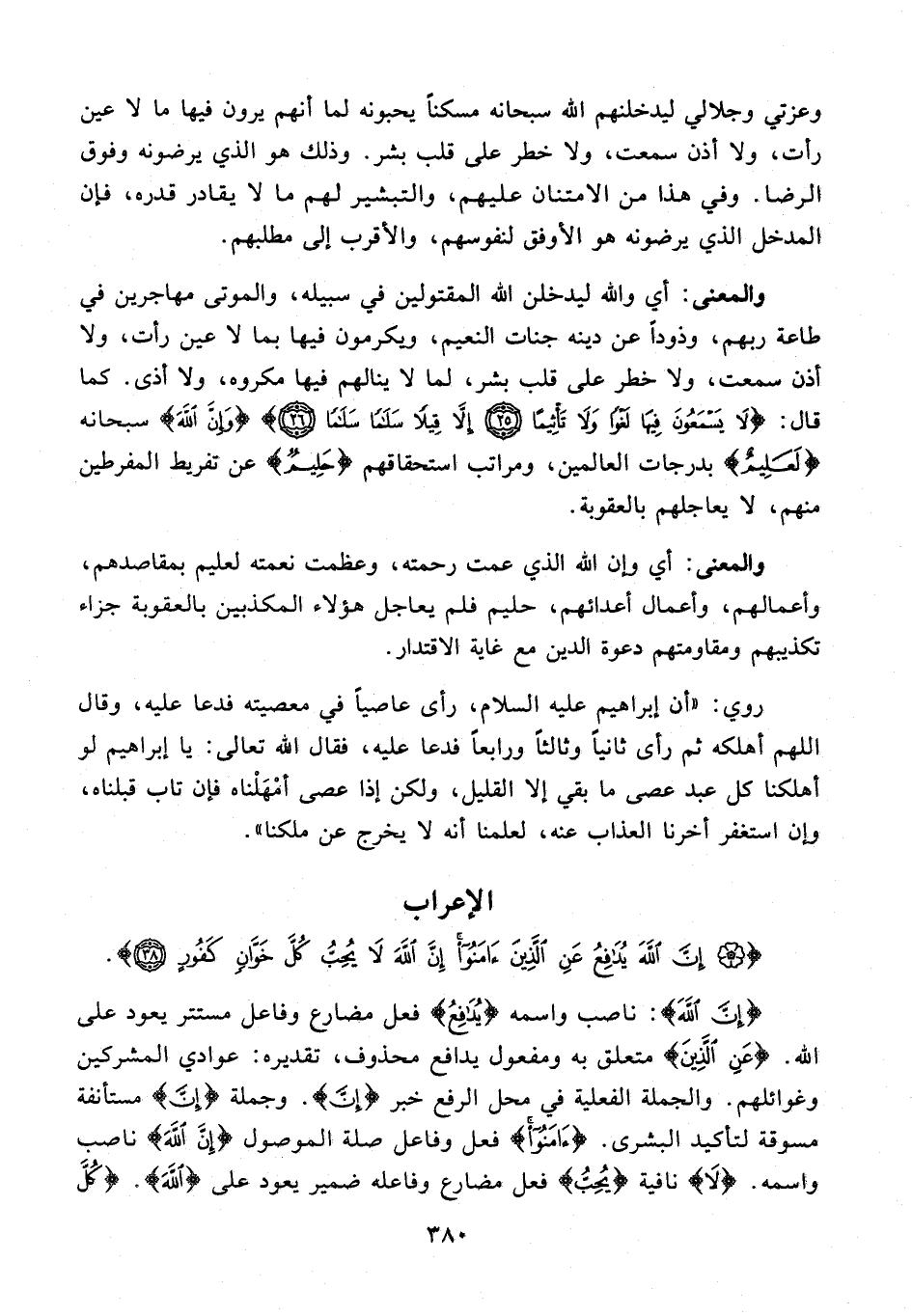 {إِنَّ اللَّهَ}: ناصب واسمه {يُدَافِعُ} فعل مضارع وفاعل مستتر يعود على الله. {عَنِ الَّذِينَ} متعلق به ومفعول يدافع محذوف، تقديره: عوادي المشركين وغوائلهم. والجملة الفعلية في محل الرفع خبر {إِنَّ}. وجملة {إِنَّ} مستأنفة مسوقة لتأكيد البشرى. {آمَنُوا} فعل وفاعل صلة الموصول {إِنَّ اللَّهَ} ناصب واسمه. {لَا} نافية {يُحِبُّ} فعل مضارع وفاعله ضمير يعود على {اللَّهَ}. {كُلَّ