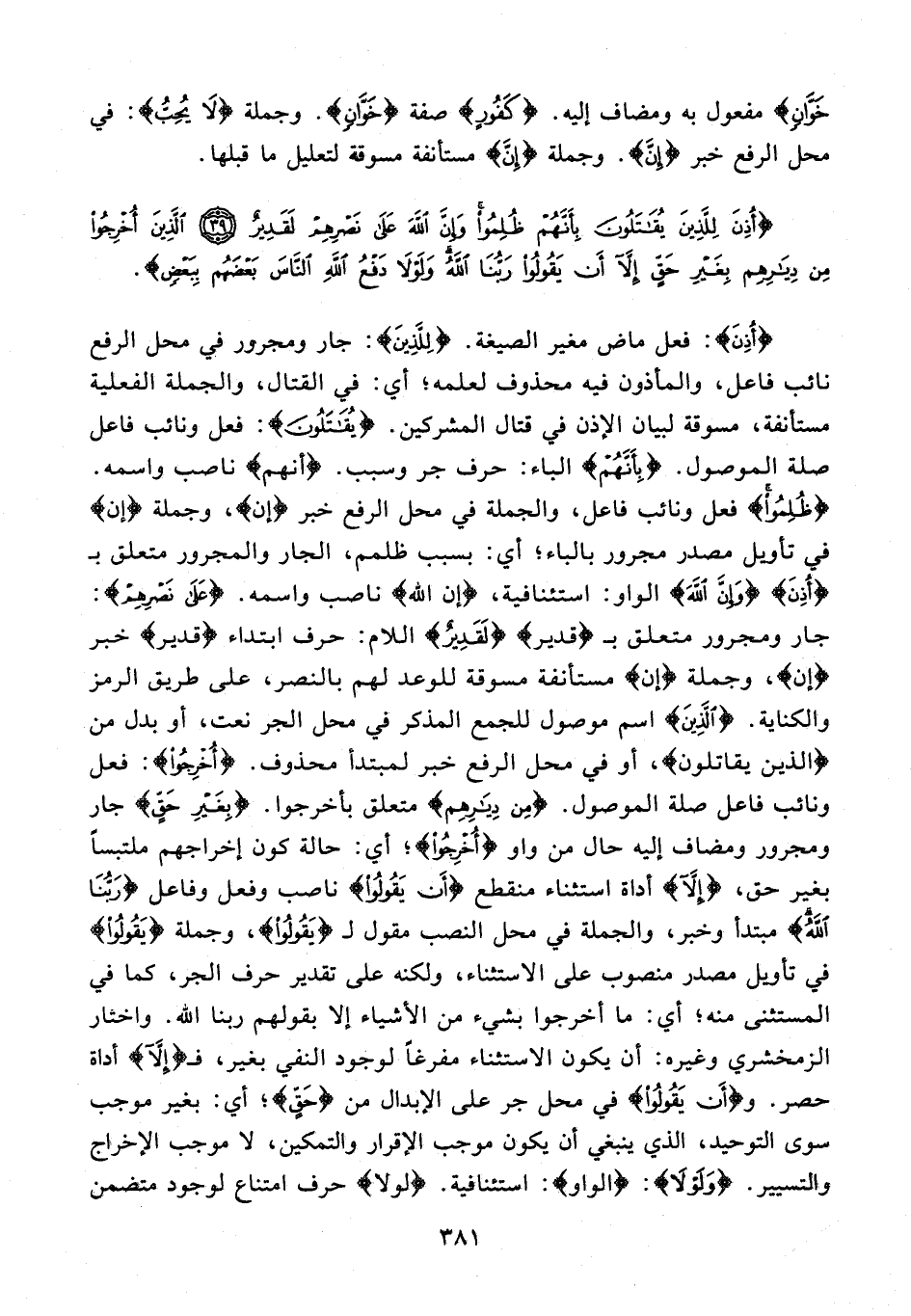{أُذِنَ}: فعل ماض مغير الصيغة. {لِلَّذِينَ}: جار ومجرور في محل الرفع نائب فاعل، والمأذون فيه محذوف لعلمه؛ أي: في القتال، والجملة الفعلية مستأنفة، مسوقة لبيان الإذن في قتال المشركين. {يُقَاتَلُونَ}: فعل ونائب فاعل صلة الموصول. {بِأَنَّهُمْ} الباء: حرف جر وسبب. {أنهم} ناصب واسمه. {ظُلِمُوا} فعل ونائب فاعل، والجملة في محل الرفع خبر {إن}، وجملة {إن} في تأويل مصدر مجرور بالباء؛ أي: بسبب ظلمهم، الجار والمجرور متعلق بـ {أُذِنَ} {وَإِنَّ اللَّهَ} الواو: استئنافية، {إن الله} ناصب واسمه. {عَلَى نَصْرِهِمْ}: جار ومجرور متعلق بـ {قدير} {لَقَدِيرٌ} اللام: حرف ابتداء {قدير} خبر {إن}، وجملة {إن} مستأنفة مسوقة للوعد لهم بالنصر، على طريق الرمز والكناية. {الَّذِينَ} اسم موصول للجمع المذكر في محل الجر نعت، أو بدل من {الذين يقاتلون}، أو في محل الرفع خبر لمبتدأ محذوف. {أُخْرِجُوا}: فعل ونائب فاعل صلة الموصول. {مِنْ دِيَارِهِمْ} متعلق بأخرجوا. {بِغَيْرِ حَقٍّ} جار ومجرور ومضاف إليه حال من واو {أُخْرِجُوا}؛ أي: حالة كون إخراجهم ملتبسًا بغير حق، {إِلَّا} أداة استثناء منقطع {أَنْ يَقُولُوا} ناصب وفعل وفاعل {رَبُّنَا اللَّهُ} مبتدأ وخبر، والجملة في محل النصب مقول لـ {يَقُولُوا}، وجملة {يَقُولُوا} في تأويل مصدر منصوب على الاستثناء، ولكنه على تقدير حرف الجر، كما في المستثنى منه؛ أي: ما أخرجوا بشيء من الأشياء إلا بقولهم ربنا الله. واختار الزمخشري وغيره: أن يكون الاستثناء مفرغًا لوجود النفي بغير، فـ {إِلَّا} أداة حصر. و {أَنْ يَقُولُوا} في محل جر على الإبدال من {حَقٍّ}؛ أي: بغير موجب سوى التوحيد، الذي ينبغي أن يكون موجب الإقرار والتمكين، لا موجب الإخراج والتسيير. {وَلَوْلَا}: {الواو}: استئنافية. {لولا} حرف امتناع لوجود متضمن