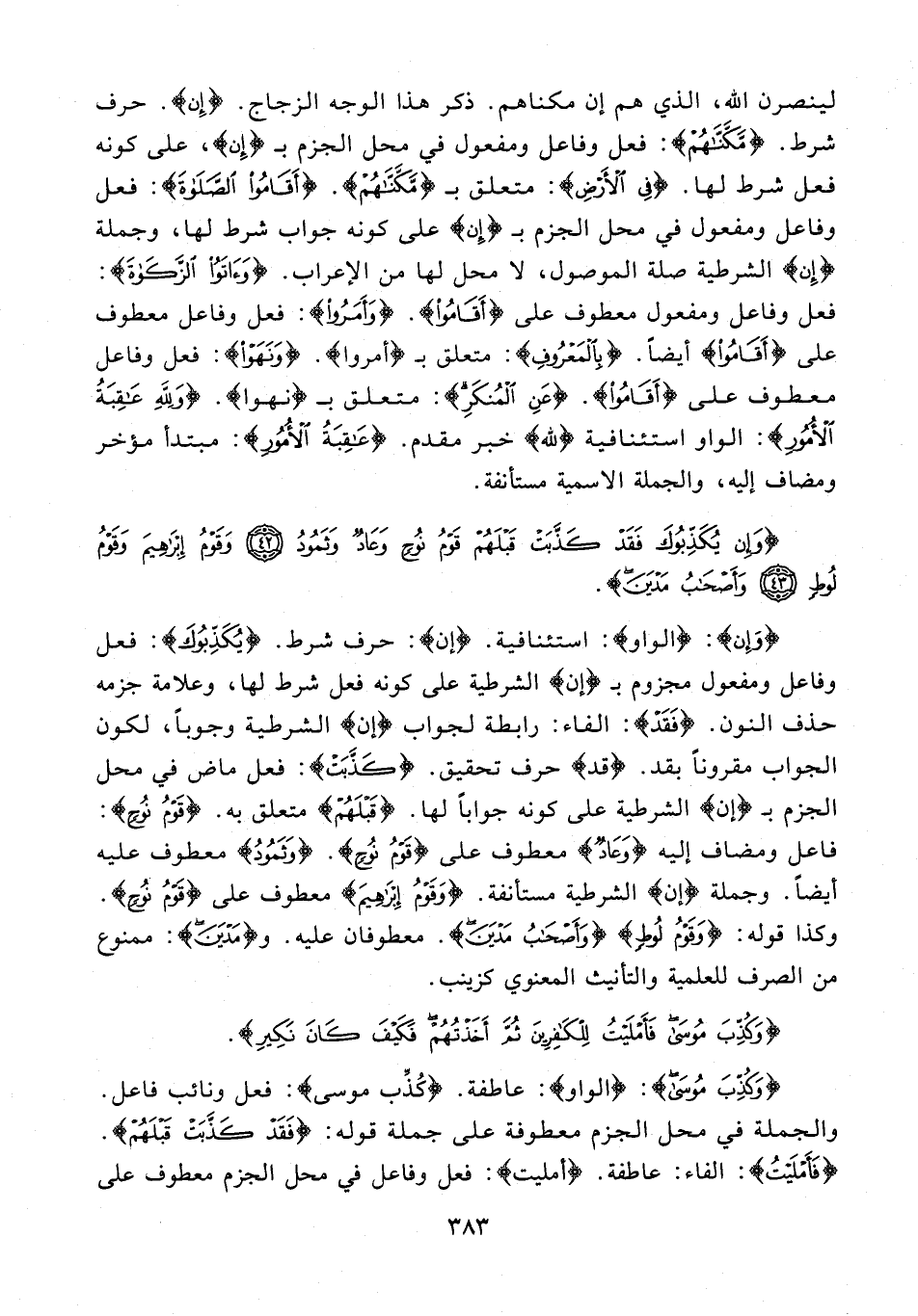 لينصرن الله، الذي هم إن مكناهم. ذكر هذا الوجه الزجاج. {إن}. حرف شرط. {مَكَّنَّاهُمْ}: فعل وفاعل ومفعول في محل الجزم بـ {إِنْ}، على كونه فعل شرط لها. {فِي الْأَرْضِ}: متعلق بـ {مَكَّنَّاهُمْ}. {أَقَامُوا الصَّلَاةَ}: فعل وفاعل ومفعول في محل الجزم بـ {إِنْ} على كونه جواب شرط لها، وجملة {إِنْ} الشرطية صلة الموصول، لا محل لها من الإعراب. {وَآتَوُا الزَّكَاةَ}: فعل وفاعل ومفعول معطوف على {أَقَامُوا}. {وَأَمَرُوا}: فعل وفاعل معطوف على {أَقَامُوا} أيضًا. {بِالْمَعْرُوفِ}: متعلق بـ {أمروا}. {وَنَهَوْا}: فعل وفاعل معطوف على {أَقَامُوا}. {عَنِ الْمُنْكَرِ}: متعلق بـ {نهوا}. {وَلِلَّهِ عَاقِبَةُ الْأُمُورِ}: الواو استئنافية {لله} خبر مقدم. {عَاقِبَةُ الْأُمُورِ}: مبتدأ مؤخر ومضاف إليه، والجملة الاسمية مستأنفة.