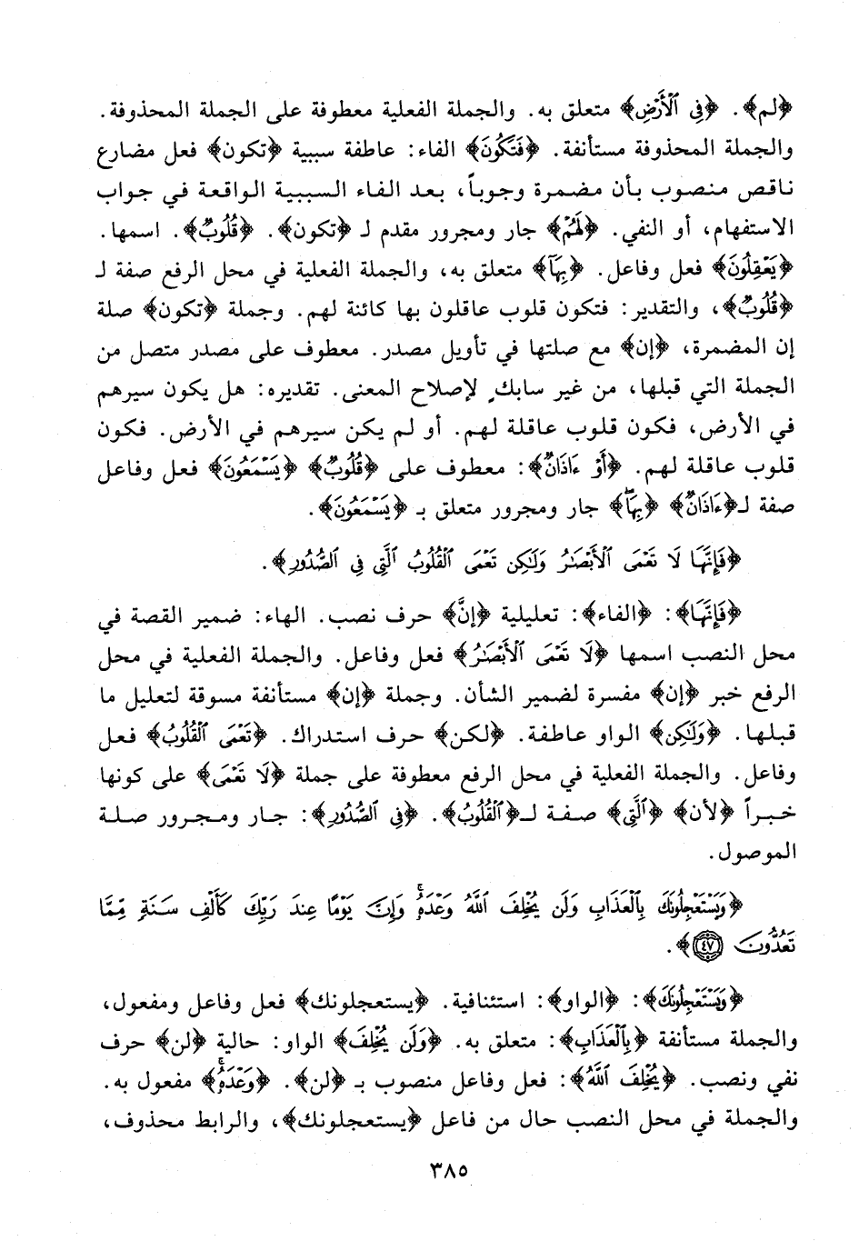 {فَإِنَّهَا}: {الفاء}: تعليلية {إنَّ} حرف نصب. الهاء: ضمير القصة في محل النصب اسمها {لَا تَعْمَى الْأَبْصَارُ} فعل وفاعل. والجملة الفعلية في محل الرفع خبر {إن} مفسرة لضمير الشأن. وجملة {إن} مستأنفة مسوقة لتعليل ما قبلها. {وَلَكِنْ} الواو عاطفة. {لكن} حرف استدراك. {تَعْمَى الْقُلُوبُ} فعل وفاعل. والجملة الفعلية في محل الرفع معطوفة على جملة {لَا تَعْمَى} على كونها خبرًا {لأن} {الَّتِي} صفة لـ {الْقُلُوبُ}. {فِي الصُّدُورِ}: جار ومجرور صلة الموصول.