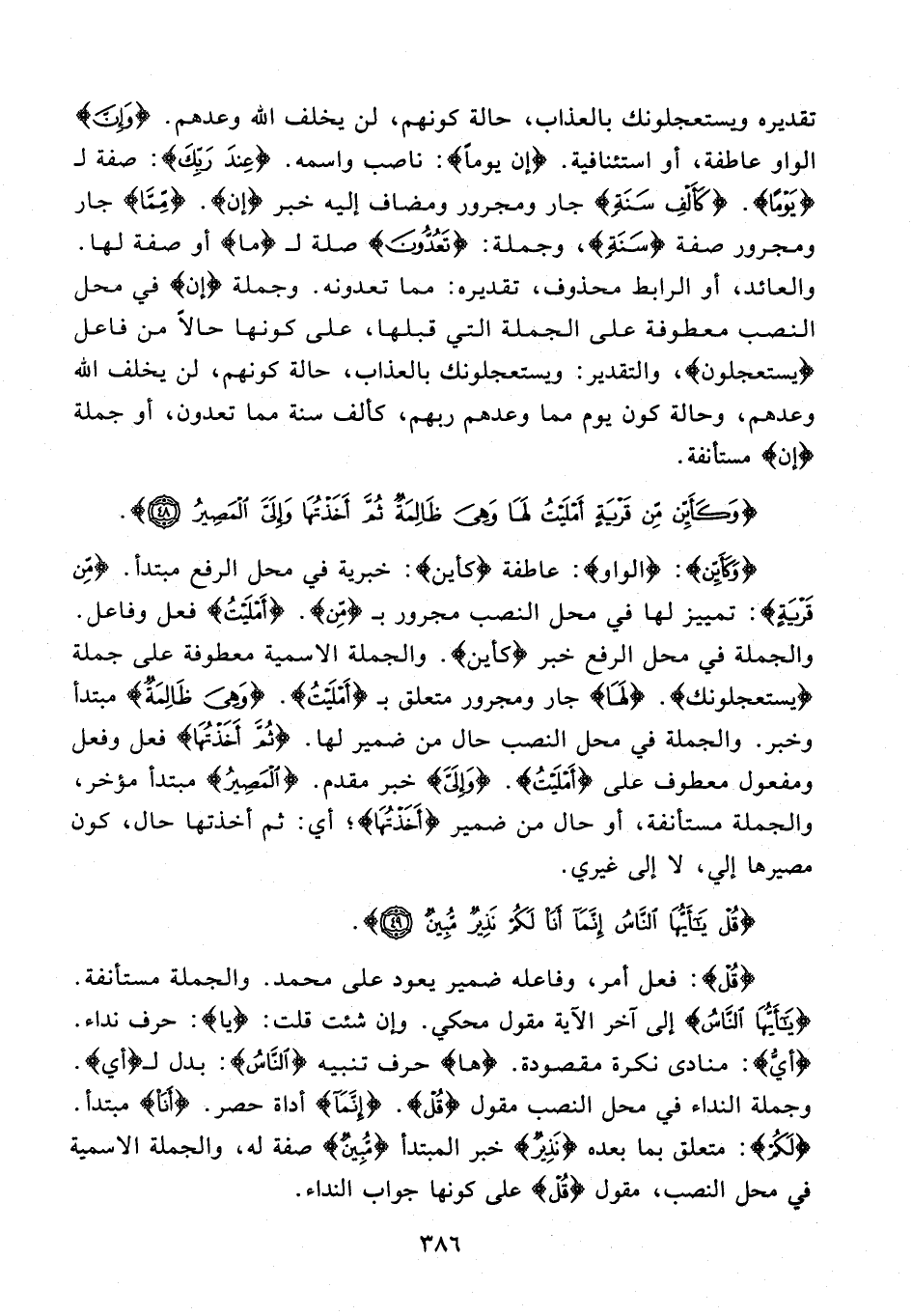 تقديره ويستعجلونك بالعذاب، حالة كونهم، لن يخلف الله وعدهم. {وَإِنَّ} الواو عاطفة، أو استئنافية. {إن يومًا}: ناصب واسمه. {عِنْدَ رَبِّكَ}: صفة لـ {يَوْمًا}. {كَأَلْفِ سَنَةٍ} جار ومجرور ومضاف إليه خبر {إن}. {مِمَّا} جار ومجرور صفة {سَنَةٍ}، وجملة: {تَعُدُّونَ} صلة لـ {ما} أو صفة لها. والعائد، أو الرابط محذوف، تقديره: مما تعدونه. وجملة {إن} في محل النصب معطوفة على الجملة التي قبلها، على كونها حالًا من فاعل {يستعجلون}، والتقدير: ويستعجلونك بالعذاب، حالة كونهم، لن يخلف الله وعدهم، وحالة كون يوم مما وعدهم ربهم، كألف سنة مما تعدون، أو جملة {إن} مستأنفة.