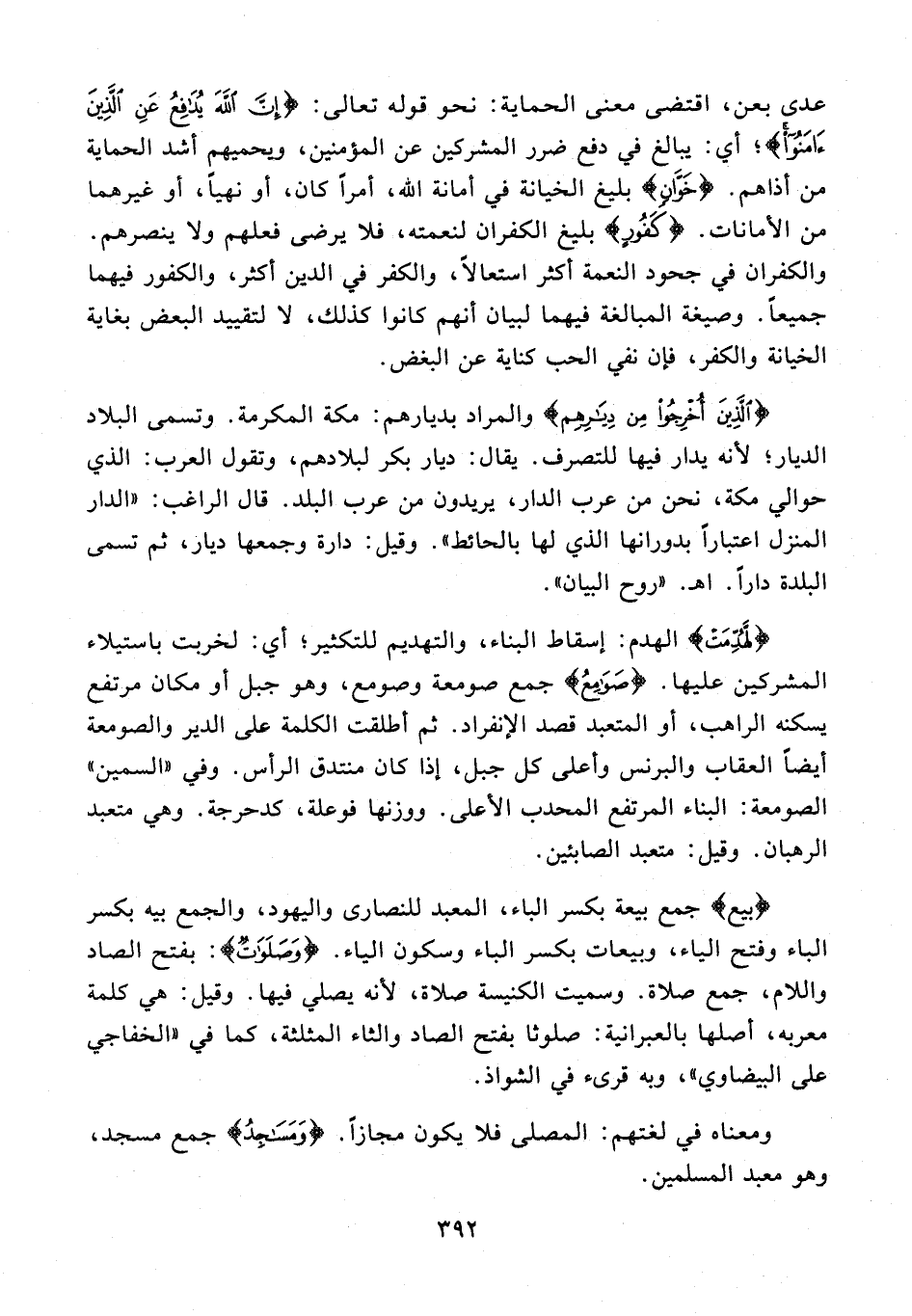 {لَهُدِّمَتْ} الدم: إسقاط البناء، والتهديم للتكثير؛ أي: لخربت باستيلاء المشركين عليها. {صَوَامِعُ} جمع صومعة وصومع، وهو جبل أو مكان مرتفع يسكنه الراهب، أو المتعبد قصد الإنفراد. ثم أطلقت الكلمة على الدير والصومعة أيضًا العقاب والبرنس وأعلى كل جبل، إذا كان منتدق الرأس. وفي "السمين" الصومعة: البناء المرتفع المحدب الأعلى. ووزنها فوعلة، كدحرجة. وهي متعبد الرهبان. وقيل: متعبد الصابئين.