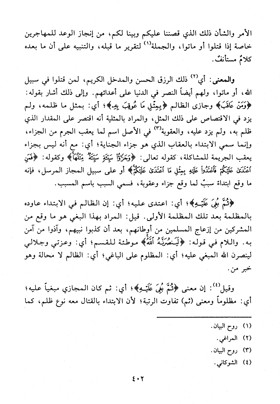 وقيل (¬4): إن معنى {ثُمَّ بُغِيَ عَلَيْهِ}؛ أي: ثم كان المجازي مبغيًا عليه؛ أي: مظلوماً ومعنى (ثم) تفاوت الرتبة؛ لأن الابتداء بالقتال معه نوع ظلم، كما