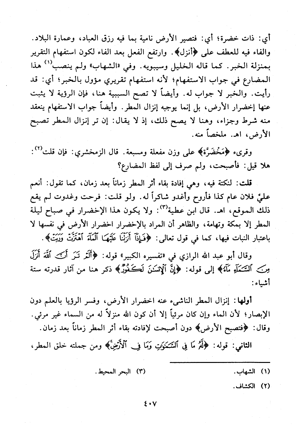 قلت: لنكتة فيه، وهي إفادة بقاء أثر المطر زمانًا بعد زمان، كما تقول: أنعم عليَّ فلان عام كذا فأروح وأغدو شاكرًا له. ولو قلت: فرحت وغدوت لم يقع ذلك الموقع، اهـ. قال ابن عطية (¬3): ولا يكون هذا الإخضرار في صباح ليلة المطر إلا بمكة وتهامة، والظاهر أن المراد بالإخضرار اخضرار الأرض في نفسها لا باعتبار النبات فيها، كما في قول تعالى: {فَإِذَا أَنْزَلْنَا عَلَيْهَا الْمَاءَ اهْتَزَّتْ وَرَبَتْ}.