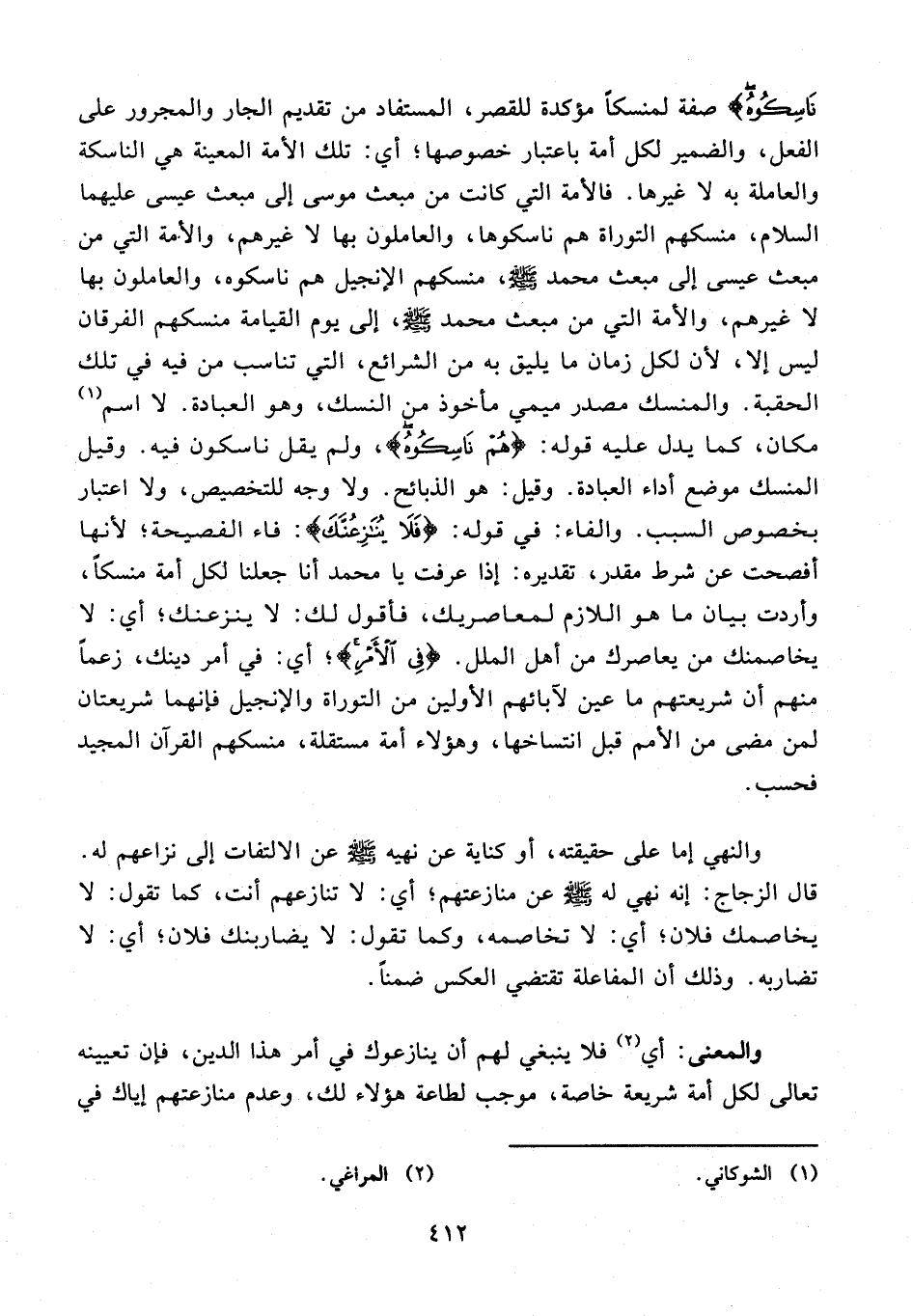نَاسِكُوهُ} صفة لمنسكًا مؤكدة للقصر، المستفاد من تقديم الجار والمجرور على الفعل، والضمير لكل أمة باعتبار خصوصها؛ أي: تلك الأمة المعينة هي الناسكة والعاملة به لا غيرها. فالأمة التي كانت من مبعث موسى إلى مبعث عيسى عليهما السلام، منسكهم التوراة هم ناسكوها، والعاملون بها لا غيرهم، والأمة التي من مبعث عيسى إلى مبعث محمد - صلى الله عليه وسلم -، منسكهم الإنجيل هم ناسكوه، والعاملون بها لا غيرهم، والأمة التي من مبعث محمد - صلى الله عليه وسلم -، إلى يوم القيامة منسكهم الفرقان ليس إلا، لأن لكل زمان ما يليق به من الشرائع، التي تناسب من فيه في تلك الحقبة. والمنسك مصدر ميمي مأخوذ من النسك، وهو العبادة. لا اسم (¬1) مكان، كما يدل عليه قوله: {هُمْ نَاسِكُوهُ}، ولم يقل ناسكون فيه. وقيل المنسك موضع أداء العبادة. وقيل: هو الذبائح. ولا وجه للتخصيص، ولا اعتبار بخصوص السبب. والفاء: في قوله: {فَلَا يُنَازِعُنَّكَ}: فاء الفصيحة؛ لأنها أفصحت عن شرط مقدر، تقديره: إذا عرفت يا محمد أنا جعلنا لكل أمة منسكًا، وأردت بيان ما هو اللازم لمعاصريك، فأقول لك: لا ينزعنك؛ أي: لا يخاصمنك من يعاصرك من أهل الملل. {فِي الْأَمْرِ}؛ أي: في أمر دينك، زعمًا منهم أن شريعتهم ما عين لآبائهم الأولين من التوراة والإنجيل فإنهما شريعتان لمن مضى من الأمم قبل انتساخها، وهؤلاء أمة مستقلة، منسكهم القرآن المجيد فحسب.