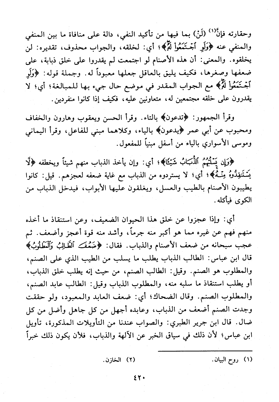 أي: وإذا عجزوا عن خلق هذا الحيوان الضعيف، وعن استنقاذ ما أخذه منهم فهم عن غيره مما هو أكبر منه جرمًا، وأشد منه قوة أعجز وأضعف. ثم عجيب سبحانه من ضعف الأصنام والذباب. فقال: {ضَعُفَ الطَّالِبُ وَالْمَطْلُوبُ} قال ابن عباس: الطالب الذباب يطلب ما يسلب من الطيب الذي على الصنم، والمطلوب هو الصنم. وقيل: الطالب الصنم، من حيث إنه يطلب خلق الذباب، أو يطلب استنقاذ ما سلبه منه، والمطلوب الذباب وقيل: الطالب عابد الصنم، والمطلوب الصنم. وقال الضحاك؛ أي: ضعف العابد والمعبود، ولو حققت وجدت الصنم أضعف من الذباب، وعابده أجهل من كل جاهل وأضل من كل ضال. قال ابن جرير الطبري: والصواب عندنا من التأويلات المذكورة، تأويل ابن عباس؛ لأن ذلك في سياق الخبر عن الآلهة والذباب، فلأن يكون ذلك خبرًا