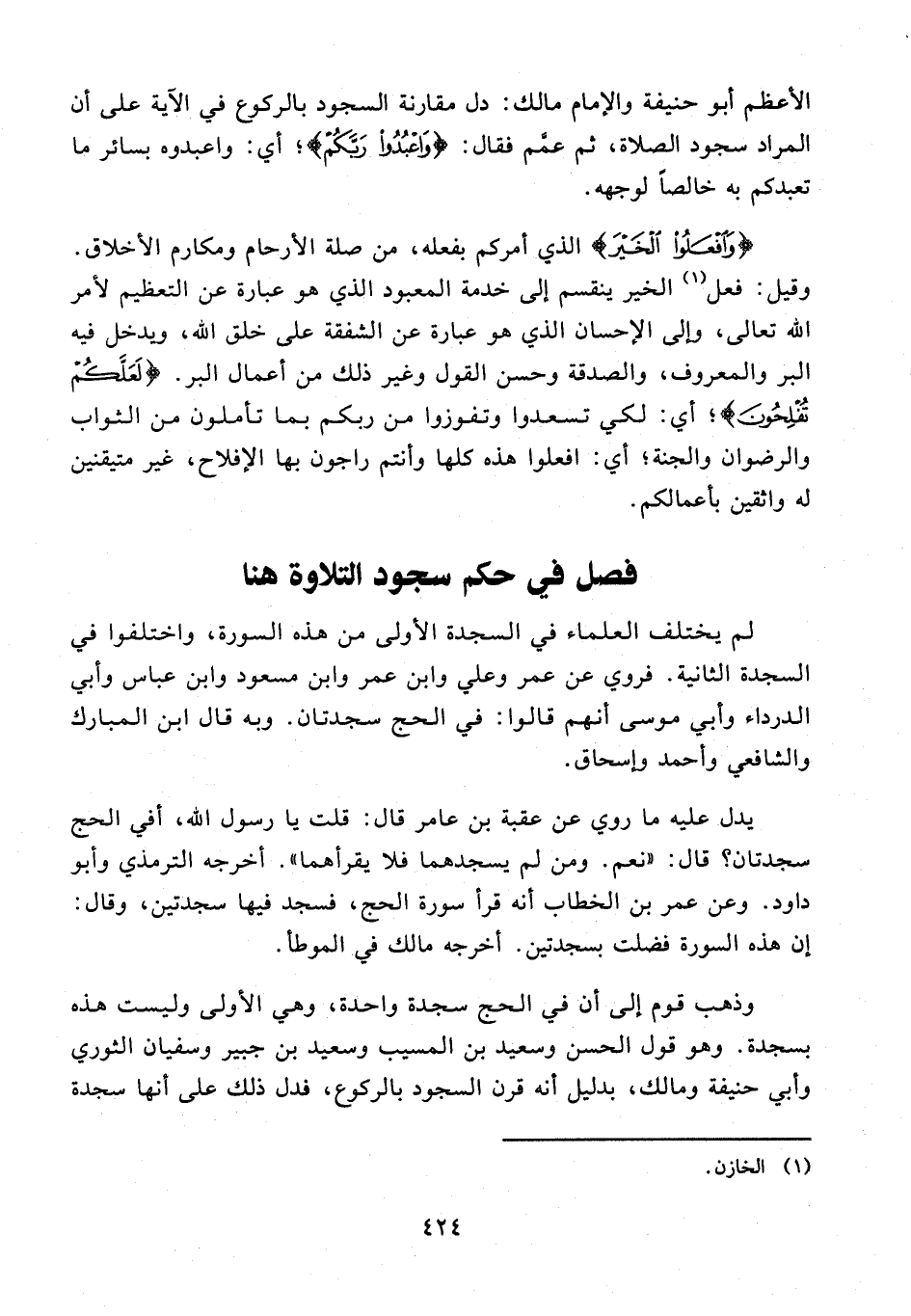 الأعظم أبو حنيفة والإمام مالك: دل مقارنة السجود بالركوع في الآية على أن المراد سجود الصلاة، ثم عمَّم فقال: {وَاعْبُدُوا رَبَّكُمْ}؛ أي: واعبدوه بسائر ما تعبدكم به خالصًا لوجهه.