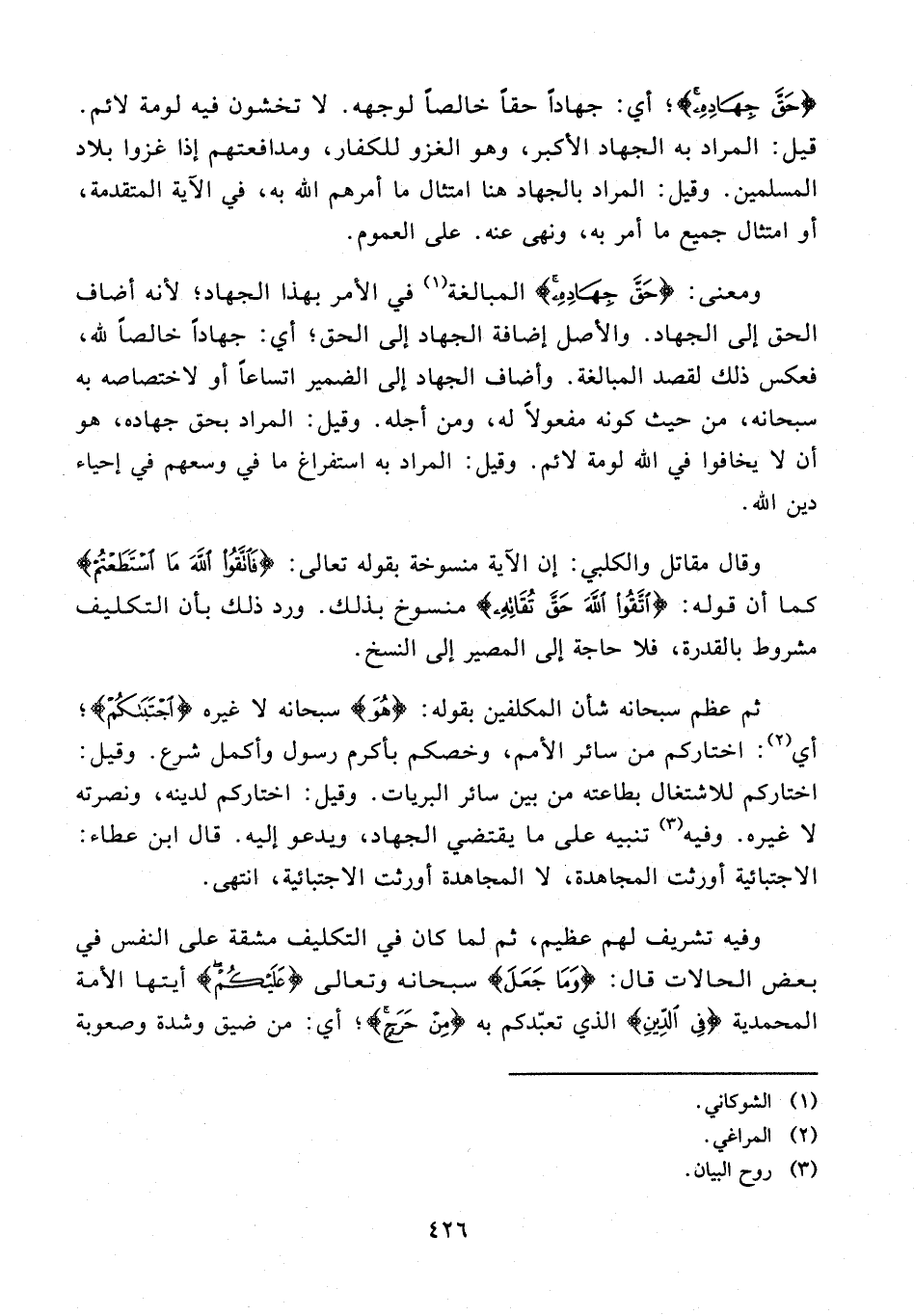 {حَقَّ جِهَادِهِ}؛ أي: جهادًا حقًا خالصًا لوجهه. لا تخشون فيه لومة لائم. قيل: المراد به الجهاد الأكبر، وهو الغزو للكفار، ومدافعتهم إذا غزوا بلاد المسلمين. وقيل: المراد بالجهاد هنا امتثال ما أمرهم الله به، في الآية المتقدمة، أو امتثال جميع ما أمر به، ونهى عنه. على العموم.