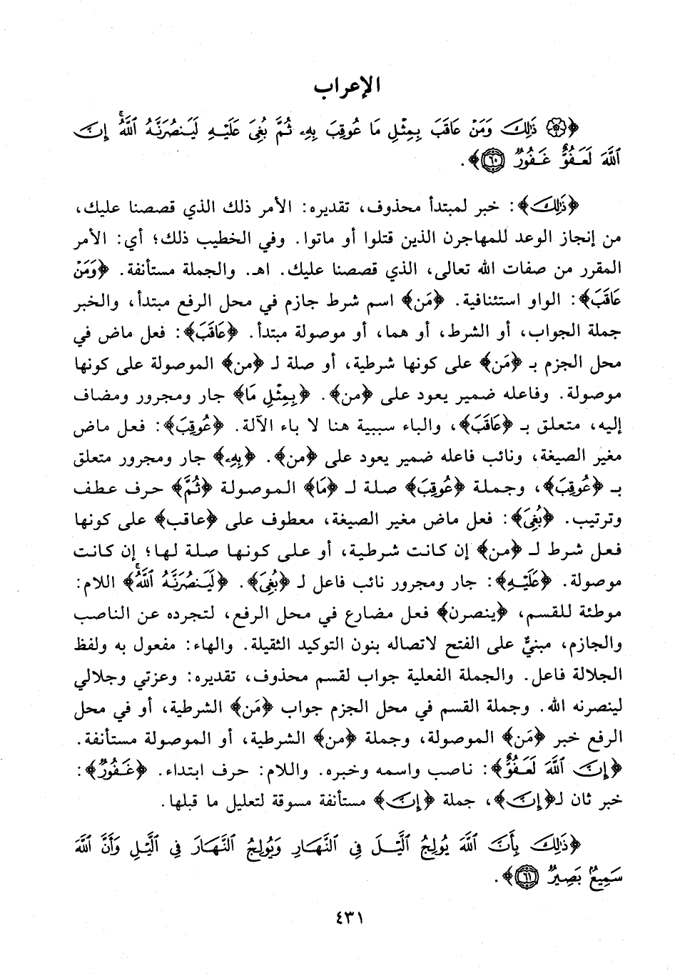 {ذَلِكَ}: خبر لمبتدأ محذوف، تقديره: الأمر ذلك الذي قصصنا عليك، من إنجاز الوعد للمهاجرن الذين قتلوا أو ماتوا. وفي الخطيب ذلك؛ أي: الأمر المقرر من صفات الله تعالى، الذي قصصنا عليك. اهـ. والجملة مستأنفة. {وَمَنْ عَاقَبَ}: الواو استئنافية. {مَن} اسم شرط جازم في محل الرفع مبتدأ، والخبر جملة الجواب، أو الشرط، أو هما، أو موصولة مبتدأ. {عَاقَبَ}: فعل ماض في محل الجزم بـ {مَن} على كونها شرطية، أو صلة لـ {من} الموصولة على كونها موصولة. وفاعله ضمير يعود على {من}. {بِمِثْلِ مَا} جار ومجرور ومضاف إليه، متعلق بـ {عَاقَبَ}، والباء سببية هنا لا باء الآلة. {عُوقِبَ}: فعل ماض مغير الصيغة، ونائب فاعله ضمير يعود على {من}. {بِهِ} جار ومجرور متعلق بـ {عُوقِبَ}، وجملة {عُوقِبَ} صلة لـ {مَا} الموصولة {ثُمَّ} حرف عطف وترتيب. {بُغِيَ}: فعل ماض مغير الصيغة، معطوف على {عاقب} على كونها فعل شرط لـ {من} إن كانت شرطية، أو على كونها صلة لها؛ إن كانت موصولة. {عَلَيْهِ}: جار ومجرور نائب فاعل لـ {بُغِيَ}. {لَيَنْصُرَنَّهُ اللَّهُ} اللام: موطئة للقسم، {ينصرن} فعل مضارع في محل الرفع، لتجرده عن الناصب والجازم، مبنيٌّ على الفتح لاتصاله بنون التوكيد الثقيلة. والهاء: مفعول به ولفظ الجلالة فاعل. والجملة الفعلية جواب لقسم محذوف، تقديره: وعزتي وجلالي لينصرنه الله. وجملة القسم في محل الجزم جواب {مَن} الشرطية، أو في محل الرفع خبر {مَن} الموصولة، وجملة {من} الشرطية، أو الموصولة مستأنفة. {إِنَّ اللَّهَ لَعَفُوٌّ}: ناصب واسمه وخبره. واللام: حرف ابتداء. {غَفُورٌ}: خبر ثان لـ {إِنَّ}، جملة {إِنَّ} مستأنفة مسوقة لتعليل ما قبلها.