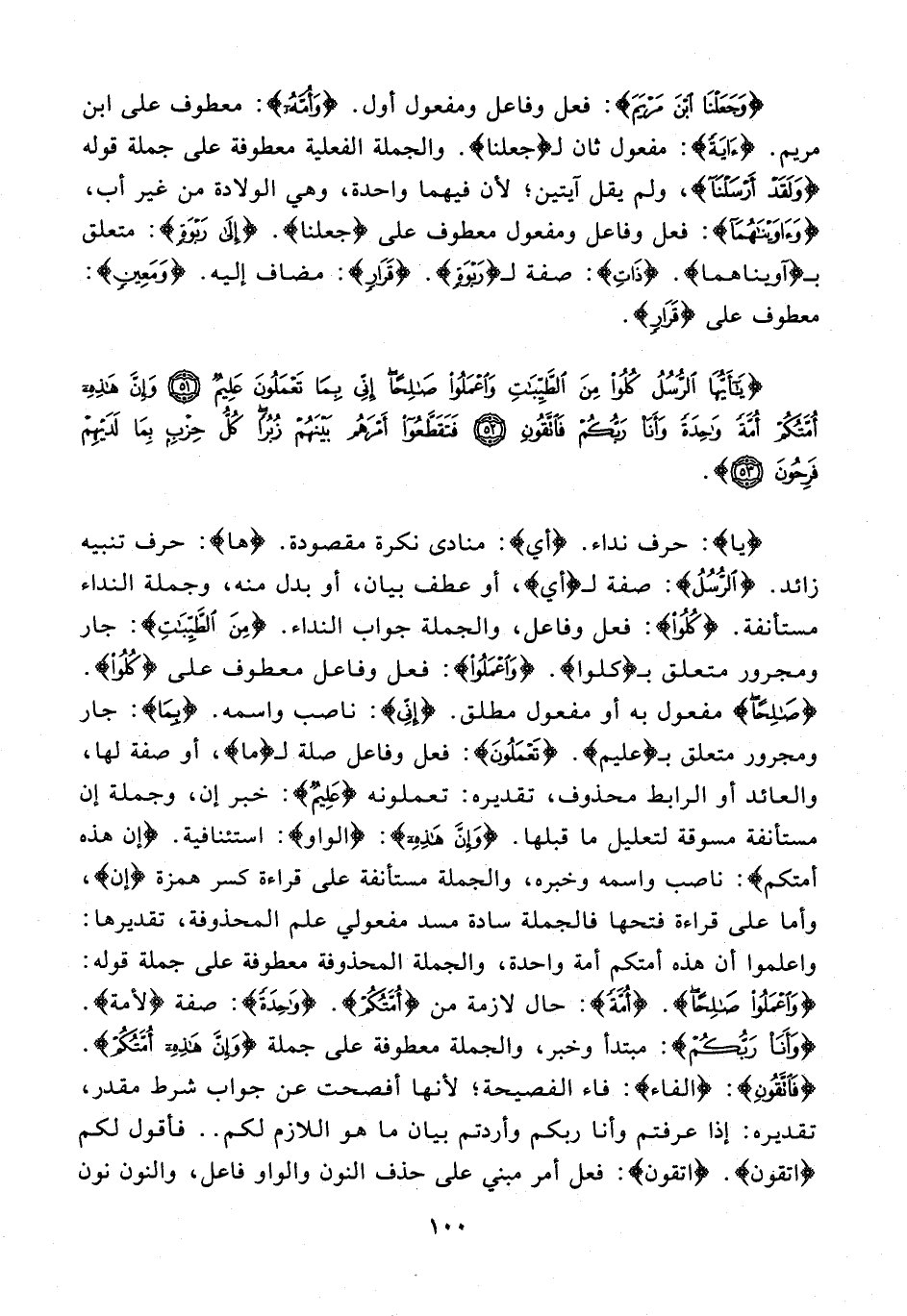 {يا}: حرف نداء. {أي}: منادى نكرة مقصودة. {ها}: حرف تنبيه زائد. {الرُّسُلُ}: صفة لـ {أي}، أو عطف بيان، أو بدل منه، وجملة النداء مستأنفة. {كُلُوا}: فعل وفاعل، والجملة جواب النداء. {مِنَ الطَّيِّبَاتِ}: جار ومجرور متعلق بـ {كلوا}. {وَاعْمَلُوا}: فعل وفاعل معطوف على {كُلُوا}. {صَالِحًا} مفعول به أو مفعول مطلق. {إِنِّي}: ناصب واسمه. {بِمَا}: جار ومجرور متعلق بـ {عليم}. {تَعْمَلُونَ}: فعل وفاعل صلة لـ {ما}، أو صفة لها، والعائد أو الرابط محذوف، تقديره: تعملونه {عَلِيمٌ}: خبر إن، وجملة إن مستأنفة مسوقة لتعليل ما قبلها. {وَإِنَّ هَذِهِ}: {الواو}: استئنافية. {إن هذه أمتكم}: ناصب واسمه وخبره، والجملة مستأنفة على قراءة كسر همزة {إن}، وأما على قراءة فتحها فالجملة سادة مسد مفعولي علم المحذوفة، تقديرها: واعلموا أن هذه أمتكم أمة واحدة، والجملة المحذوفة معطوفة على جملة قوله: {وَاعْمَلُوا صَالِحًا}. {أُمَّةً}: حال لازمة من {أُمَّتُكُمْ}. {وَاحِدَةً}: صفة {لامة}. {وَأَنَا رَبُّكُمْ}: مبتدأ وخبر، والجملة معطوفة على جملة {وَإِنَّ هَذِهِ أُمَّتُكُمْ}. {فَاتَّقُونِ}: {الفاء}: فاء الفصيحة؛ لأنها أفصحت عن جواب شرط مقدر، تقديره: إذا عرفتم وأنا ربكم وأردتم بيان ما هو اللازم لكم .. فأقول لكم {اتقون}. {اتقون}: فعل أمر مبني على حذف النون والواو فاعل، والنون نون
