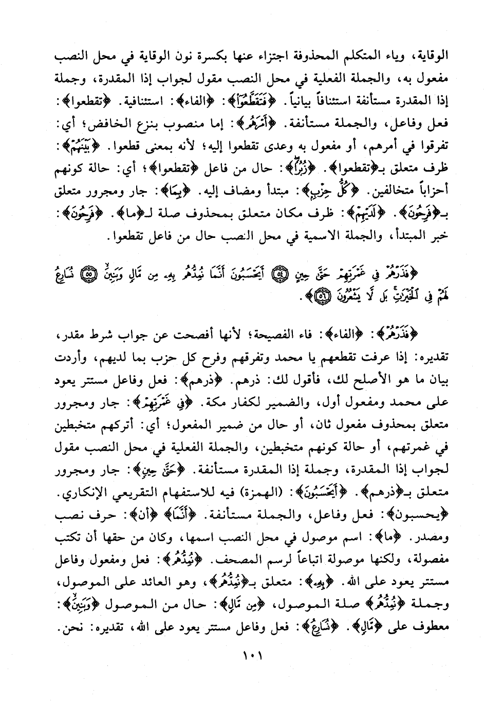 {فَذَرْهُمْ}: {الفاء}: فاء الفصيحة؛ لأنها أفصحت عن جواب شرط مقدر، تقديره: إذا عرفت تقطعهم يا محمد وتفرقهم وفرح كل حزب بما لديهم، وأردت بيان ما هو الأصلح لك، فأقول لك: ذرهم. {ذرهم}: فعل وفاعل مستتر يعود على محمد ومفعول أول، والضمير لكفار مكة. {فِي غَمْرَتِهِمْ}: جار ومجرور متعلق بمحذوف مفعول ثان، أو حال من ضمير المفعول؛ أي: أتركهم متخبطين في غمرتهم، أو حالة كونهم متخبطين، والجملة الفعلية في محل النصب مقول لجواب إذا المقدرة، وجملة إذا المقدرة مستأنفة. {حَتَّى حِينٍ}: جار ومجرور متعلق بـ {ذرهم}. {أَيَحْسَبُونَ}: (الهمزة) فيه للاستفهام التقريعي الإنكاري. {يحسبون}: فعل وفاعل، والجملة مستأنفة. {أَنَّمَا} {أن}: حرف نصب ومصدر. {ما}: اسم موصول في محل النصب اسمها، وكان من حقها أن تكتب مفصولة، ولكنها موصولة اتباعًا لرسم المصحف. {نُمِدُّهُمْ}: فعل ومفعول وفاعل مستتر يعود على الله. {بِهِ}: متعلق بـ {نُمِدُّهُمْ}، وهو العائد على الموصول، وجملة {نُمِدُّهُمْ} صلة الموصول، {مِنْ مَالٍ}: حال من الموصول {وَبَنِينَ}: معطوف على {مَالٍ}. {نُسَارِعُ}: فعل وفاعل مستتر يعود على الله، تقديره: نحن.