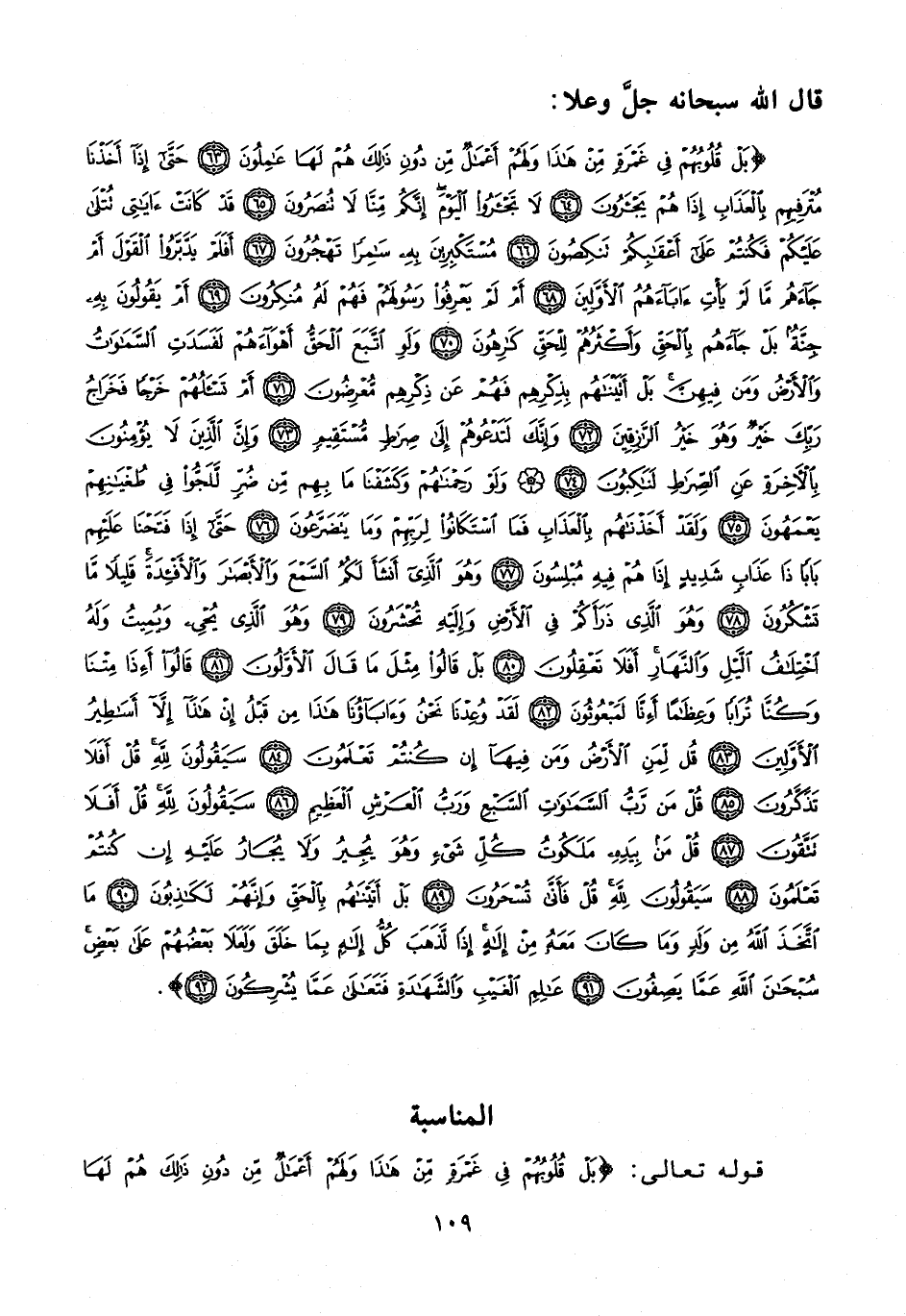 {بَلْ قُلُوبُهُمْ فِي غَمْرَةٍ مِنْ هَذَا وَلَهُمْ أَعْمَالٌ مِنْ دُونِ ذَلِكَ هُمْ لَهَا عَامِلُونَ (63) حَتَّى إِذَا أَخَذْنَا مُتْرَفِيهِمْ بِالْعَذَابِ إِذَا هُمْ يَجْأَرُونَ (64) لَا تَجْأَرُوا الْيَوْمَ إِنَّكُمْ مِنَّا لَا تُنْصَرُونَ (65) قَدْ كَانَتْ آيَاتِي تُتْلَى عَلَيْكُمْ فَكُنْتُمْ عَلَى أَعْقَابِكُمْ تَنْكِصُونَ (66) مُسْتَكْبِرِينَ بِهِ سَامِرًا تَهْجُرُونَ (67) أَفَلَمْ يَدَّبَّرُوا الْقَوْلَ أَمْ جَاءَهُمْ مَا لَمْ يَأْتِ آبَاءَهُمُ الْأَوَّلِينَ (68) أَمْ لَمْ يَعْرِفُوا رَسُولَهُمْ فَهُمْ لَهُ مُنْكِرُونَ (69) أَمْ يَقُولُونَ بِهِ جِنَّةٌ بَلْ جَاءَهُمْ بِالْحَقِّ وَأَكْثَرُهُمْ لِلْحَقِّ كَارِهُونَ (70) وَلَوِ اتَّبَعَ الْحَقُّ أَهْوَاءَهُمْ لَفَسَدَتِ السَّمَاوَاتُ وَالْأَرْضُ وَمَنْ فِيهِنَّ بَلْ أَتَيْنَاهُمْ بِذِكْرِهِمْ فَهُمْ عَنْ ذِكْرِهِمْ مُعْرِضُونَ (71) أَمْ تَسْأَلُهُمْ خَرْجًا فَخَرَاجُ رَبِّكَ خَيْرٌ وَهُوَ خَيْرُ الرَّازِقِينَ (72) وَإِنَّكَ لَتَدْعُوهُمْ إِلَى صِرَاطٍ مُسْتَقِيمٍ (73) وَإِنَّ الَّذِينَ لَا يُؤْمِنُونَ بِالْآخِرَةِ عَنِ الصِّرَاطِ لَنَاكِبُونَ (74) وَلَوْ رَحِمْنَاهُمْ وَكَشَفْنَا مَا بِهِمْ مِنْ ضُرٍّ لَلَجُّوا فِي طُغْيَانِهِمْ يَعْمَهُونَ (75) وَلَقَدْ أَخَذْنَاهُمْ بِالْعَذَابِ فَمَا اسْتَكَانُوا لِرَبِّهِمْ وَمَا يَتَضَرَّعُونَ (76) حَتَّى إِذَا فَتَحْنَا عَلَيْهِمْ بَابًا ذَا عَذَابٍ شَدِيدٍ إِذَا هُمْ فِيهِ مُبْلِسُونَ (77) وَهُوَ الَّذِي أَنْشَأَ لَكُمُ السَّمْعَ وَالْأَبْصَارَ وَالْأَفْئِدَةَ قَلِيلًا مَا تَشْكُرُونَ (78) وَهُوَ الَّذِي ذَرَأَكُمْ فِي الْأَرْضِ وَإِلَيْهِ تُحْشَرُونَ (79) وَهُوَ الَّذِي يُحْيِي وَيُمِيتُ وَلَهُ اخْتِلَافُ اللَّيْلِ وَالنَّهَارِ أَفَلَا تَعْقِلُونَ (80) بَلْ قَالُوا مِثْلَ مَا قَالَ الْأَوَّلُونَ (81) قَالُوا أَإِذَا مِتْنَا وَكُنَّا تُرَابًا وَعِظَامًا أَإِنَّا لَمَبْعُوثُونَ (82) لَقَدْ وُعِدْنَا نَحْنُ وَآبَاؤُنَا هَذَا مِنْ قَبْلُ إِنْ هَذَا إِلَّا أَسَاطِيرُ الْأَوَّلِينَ (83) قُلْ لِمَنِ الْأَرْضُ وَمَنْ فِيهَا إِنْ كُنْتُمْ تَعْلَمُونَ (84) سَيَقُولُونَ لِلَّهِ قُلْ أَفَلَا تَذَكَّرُونَ (85) قُلْ مَنْ رَبُّ السَّمَاوَاتِ السَّبْعِ وَرَبُّ الْعَرْشِ الْعَظِيمِ (86) سَيَقُولُونَ لِلَّهِ قُلْ أَفَلَا تَتَّقُونَ (87) قُلْ مَنْ بِيَدِهِ مَلَكُوتُ كُلِّ شَيْءٍ وَهُوَ يُجِيرُ وَلَا يُجَارُ عَلَيْهِ إِنْ كُنْتُمْ تَعْلَمُونَ (88) سَيَقُولُونَ لِلَّهِ قُلْ فَأَنَّى تُسْحَرُونَ (89) بَلْ أَتَيْنَاهُمْ بِالْحَقِّ وَإِنَّهُمْ لَكَاذِبُونَ (90) مَا اتَّخَذَ اللَّهُ مِنْ وَلَدٍ وَمَا كَانَ مَعَهُ مِنْ إِلَهٍ إِذًا لَذَهَبَ كُلُّ إِلَهٍ بِمَا خَلَقَ وَلَعَلَا بَعْضُهُمْ عَلَى بَعْضٍ سُبْحَانَ اللَّهِ عَمَّا يَصِفُونَ (91) عَالِمِ الْغَيْبِ وَالشَّهَادَةِ فَتَعَالَى عَمَّا يُشْرِكُونَ (92)}