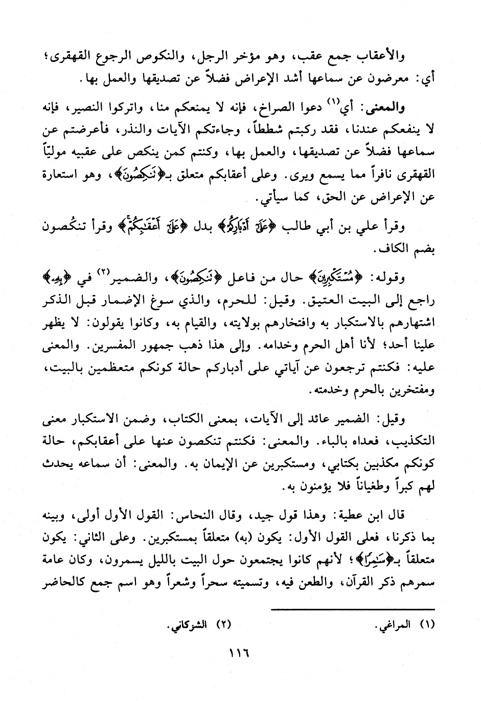 وقيل: الضمير عائد إلى الآيات، بمعنى الكتاب، وضمن الاستكبار معنى التكذيب، فعداه بالباء. والمعنى: فكنتم تنكصون عنها على أعقابكم، حالة كونكم مكذبين بكتابي، ومستكبرين عن الإيمان به. والمعنى: أن سماعه يحدث لهم كبرًا وطغيانًا فلا يؤمنون به.