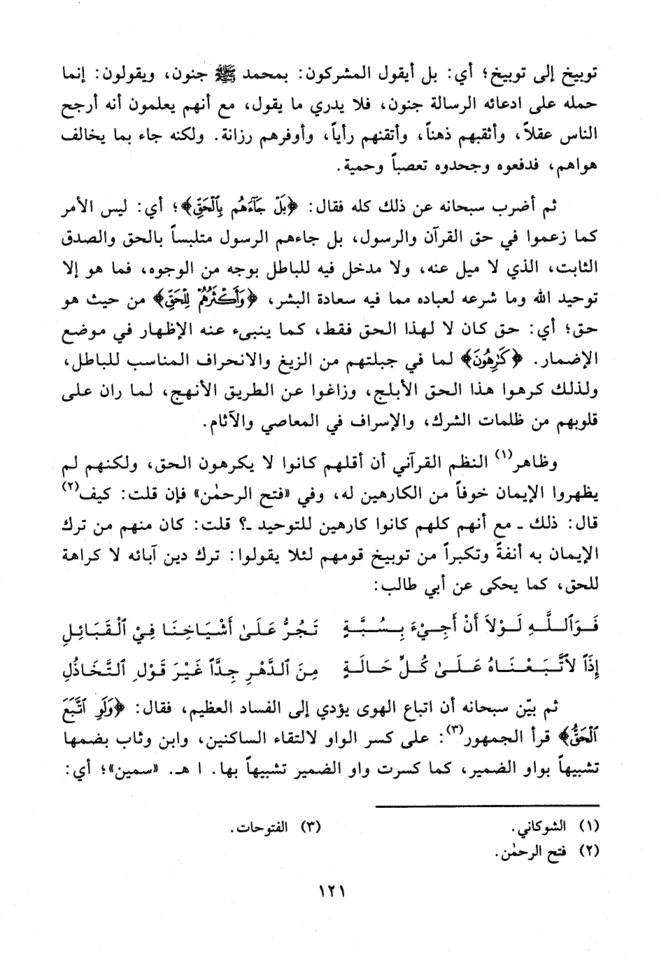 71 - ثم بيَّن سبحانه أن اتباع الهوى يؤدي إلى الفساد العظيم، فقال: {وَلَوِ اتَّبَعَ الْحَقُّ} قرأ الجمهور (¬3): على كسر الواو لالتقاء الساكنين، وابن وثاب بضمها تشبيهًا بواو الضمير، كما كسرت واو الضمير تشبيهًا بها. اهـ. "سمين"؛ أي: