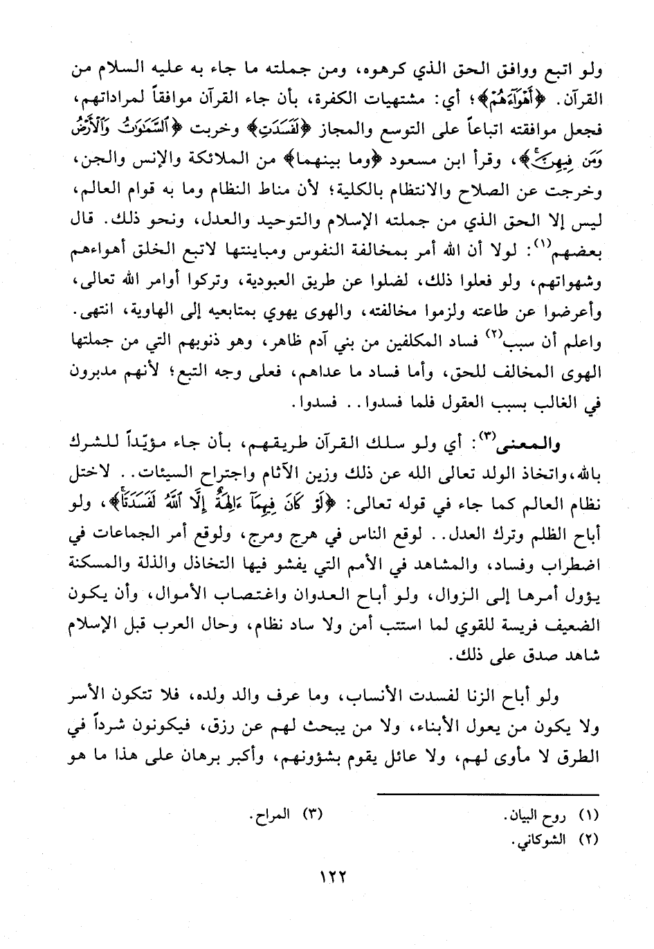 والمعنى (¬3): أي ولو سلك القرآن طريقهم، بأن جاء مؤيّدًا للشرك بالله، واتخاذ الولد تعالى الله عن ذلك وزين الآثام واجتراح السيئات .. لاختل نظام العالم كما جاء في قوله تعالى: {لَوْ كَانَ فِيهِمَا آلِهَةٌ إِلَّا اللَّهُ لَفَسَدَتَا}، ولو أباح الظلم وترك العدل .. لوقع الناس في هرج ومرج، ولوقع أمر الجماعات في اضطراب وفساد، والمشاهد في الأمم التي يفشو فيها التخاذل والذلة والمسكنة يؤول أمرها إلى الزوال، ولو أباح العدوان واغتصاب الأموال، وأن يكون الضعيف فريسة للقوي لما استتب أمن ولا ساد نظام، وحال العرب قبل الإِسلام شاهد صدق على ذلك.
