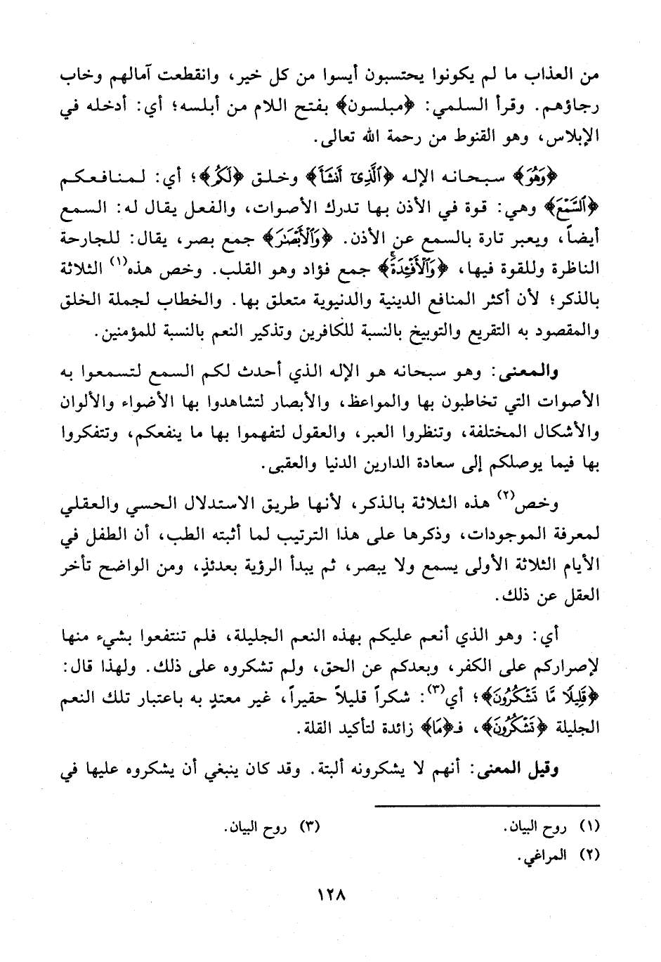 78 - {وَهُوَ} سبحانه الإله {الَّذِي أَنْشَأَ} وخلق {لَكُمُ}؛ أي: لمنافعكم {السَّمْعَ} وهي: قوة في الأذن بها تدرك الأصوات، والفعل يقال له: السمع أيضًا، ويعبر تارة بالسمع عن الأذن. {وَالْأَبْصَارَ} جمع بصر، يقال للجارحة الناظرة وللقوة فيها، {وَالْأَفْئِدَةَ} جمع فؤاد وهو القلب. وخص هذه (¬1) الثلاثة بالذكر؛ لأن أكثر المنافع الدينية والدنيوية متعلق بها. والخطاب لجملة الخلق والمقصود به التقريع والتوبيخ بالنسبة للكافرين وتذكير النعم بالنسبة للمؤمنين.