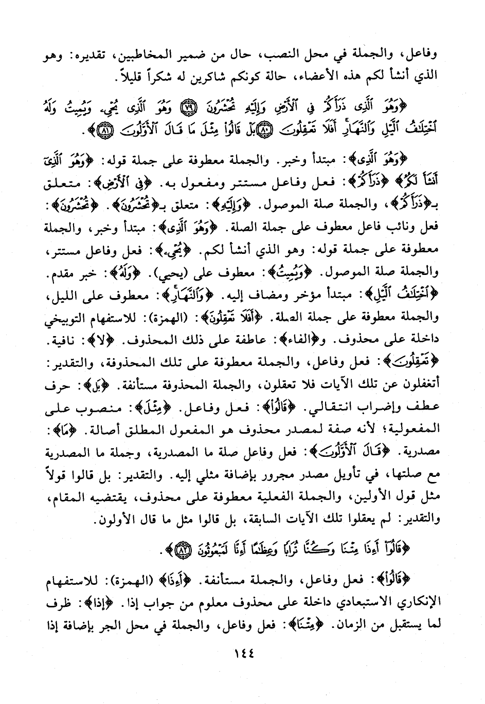 {وَهُوَ الَّذِي}: مبتدأ وخبر. والجملة معطوفة على جملة قوله: {وَهُوَ الَّذِي أَنْشَأَ لَكُمُ} {ذَرَأَكُمْ}: فعل وفاعل مستتر ومفعول به. {فِي الْأَرْضِ}: متعلق بـ {ذَرَأَكُمْ}، والجملة صلة الموصول. {وَإِلَيْهِ}: متعلق بـ {تُحْشَرُونَ}. {تُحْشَرُونَ}: فعل ونائب فاعل معطوف على جملة الصلة. {وَهُوَ الَّذِي}: مبتدأ وخبر، والجملة معطوفة على جملة قوله: وهو الذي أنشأ لكم. {يُحْيِي}: فعل وفاعل مستتر، والجملة صلة الموصول. {وَيُمِيتُ}: معطوف على {يحي}. {وَلَهُ}: خبر مقدم. {اخْتِلَافُ اللَّيْلِ}: مبتدأ مؤخر ومضاف إليه. {وَالنَّهَارِ}: معطوف على الليل، والجملة معطوفة على جملة الصلة. {أَفَلَا تَعْقِلُونَ}: (الهمزة)؛ للاستفهام التوبيخي داخلة على محذوف. و {الفاء}: عاطفة على ذلك المحذوف. {لا}: نافية. {تَعْقِلُونَ}: فعل وفاعل، والجملة معطوفة على تلك المحذوفة، والتقدير: أتغفلون عن تلك الآيات فلا تعقلون، والجملة المحذوفة مستأنفة. {بَلْ}: حرف عطف وإضراب انتقالي. {قَالُوا}: فعل وفاعل. {مِثْلَ}: منصوب على المفعولية؛ لأنه صفة لمصدر محذوف هو المفعول المطلق أصالة. {مَا}: مصدرية. {قَالَ الْأَوَّلُونَ}: فعل وفاعل صلة ما المصدرية، وجملة ما المصدرية مع صلتها، في تأويل مصدر مجرور بإضافة مثلي إليه. والتقدير: بل قالوا قولًا مثل قول الأولين، والجملة الفعلية معطوفة على محذوف، يقتضيه المقام، والتقدير: لم يعقلوا تلك الآيات السابقة، بل قالوا مثل ما قال الأولون.