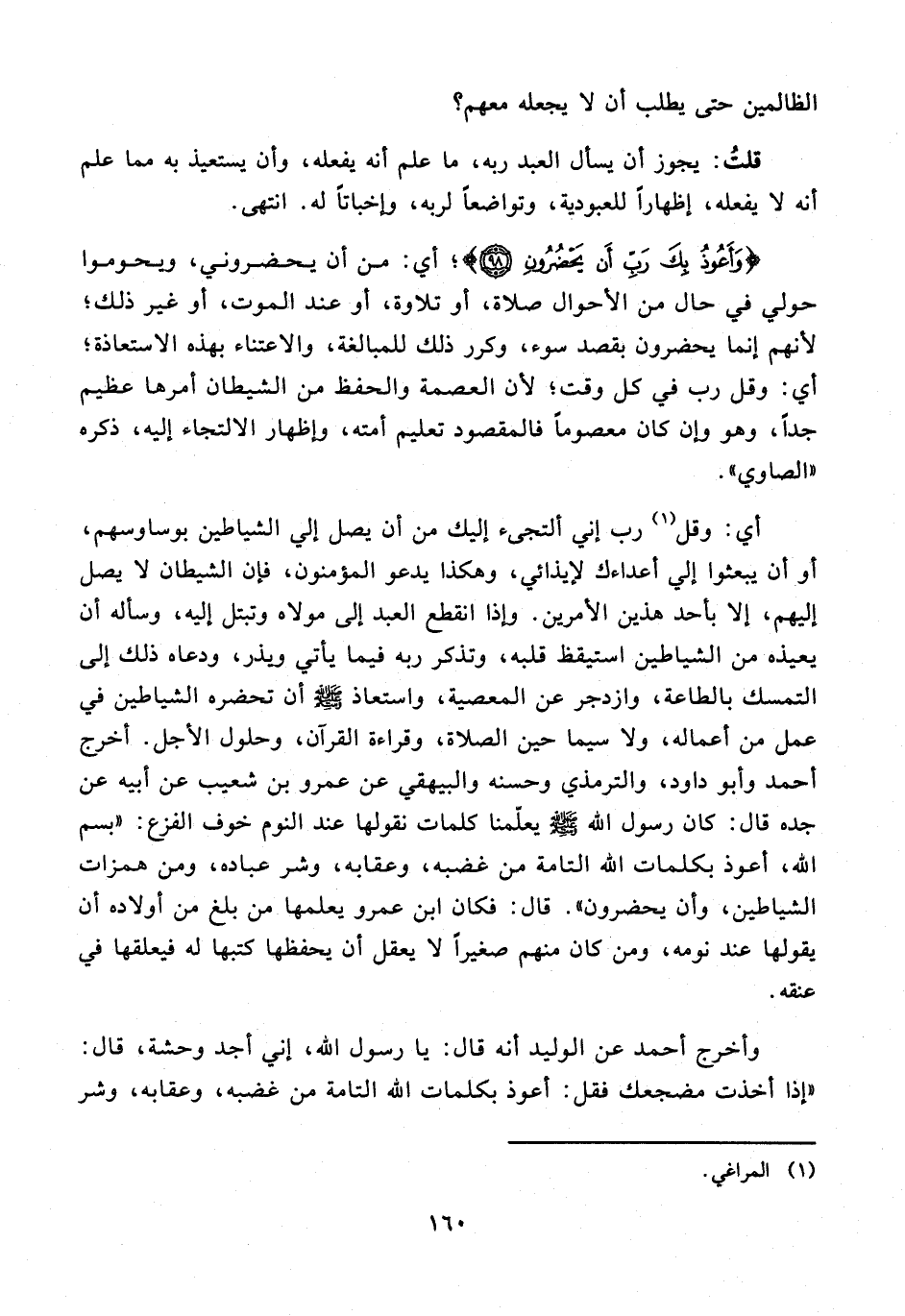 أي: وقل (¬1) رب إني ألتجىء إليك من أن يصل إلى الشياطين بوساوسهم، أو أن يبعثوا إلى أعداءك لإيذائي، وهكذا يدعو المؤمنون، فإن الشيطان لا يصل إليهم، إلا بأحد هذين الأمرين. وإذا انقطع العبد إلى مولاه وتبتل إليه، وسأله أن يعيذه من الشياطين استيقظ قلبه، وتذكر ربه فيما يأتي ويذر، ودعاه ذلك إلى التمسك بالطاعة، وازدجر عن المعصية، واستعاذ - صلى الله عليه وسلم - أن تحضره الشياطين فى عمل من أعماله، ولا سيما حين الصلاة، وقراءة القرآن، وحلول الأجل. أخرج أحمد وأبو داود، والترمذي وحسنه والبيهقي عن عمرو بن شعيب عن أبيه عن جده قال: كان رسول الله - صلى الله عليه وسلم - يعلّمنا كلمات نقولها عند النوم خوف الفزع: "بسم الله، أعوذ بكلمات الله التامة من غضبه، وعقابه، وشر عباده، ومن همزات الشياطين، وأن يحضرون". قال: فكان ابن عمرو يعلمها من بلغ من أولاده أن يقولها عند نومه، ومن كان منهم صغيرًا لا يعقل أن يحفظها كتبها له فيعلقها فى عنقه.