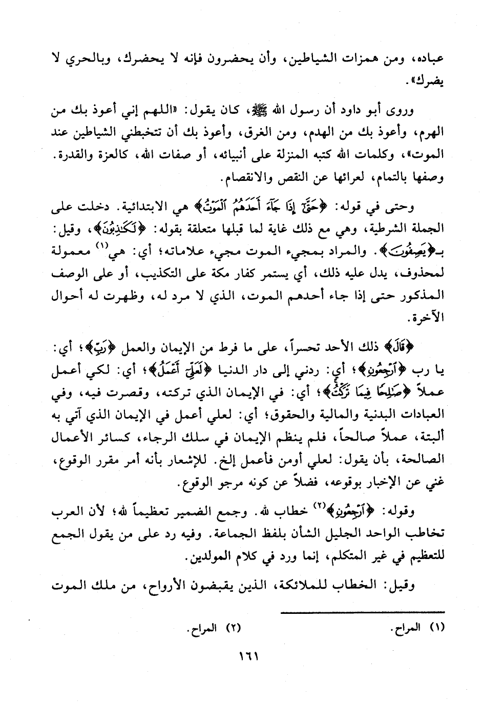 وقوله: {ارْجِعُونِ} (¬2) خطاب لله. وجمع الضمير تعظيمًا لله؛ لأن العرب تخاطب الواحد الجليل الشأن بلفظ الجماعة. وفيه رد على من يقول الجمع للتعظيم فى غير المتكلم، إنما ورد فى كلام المولدين.
