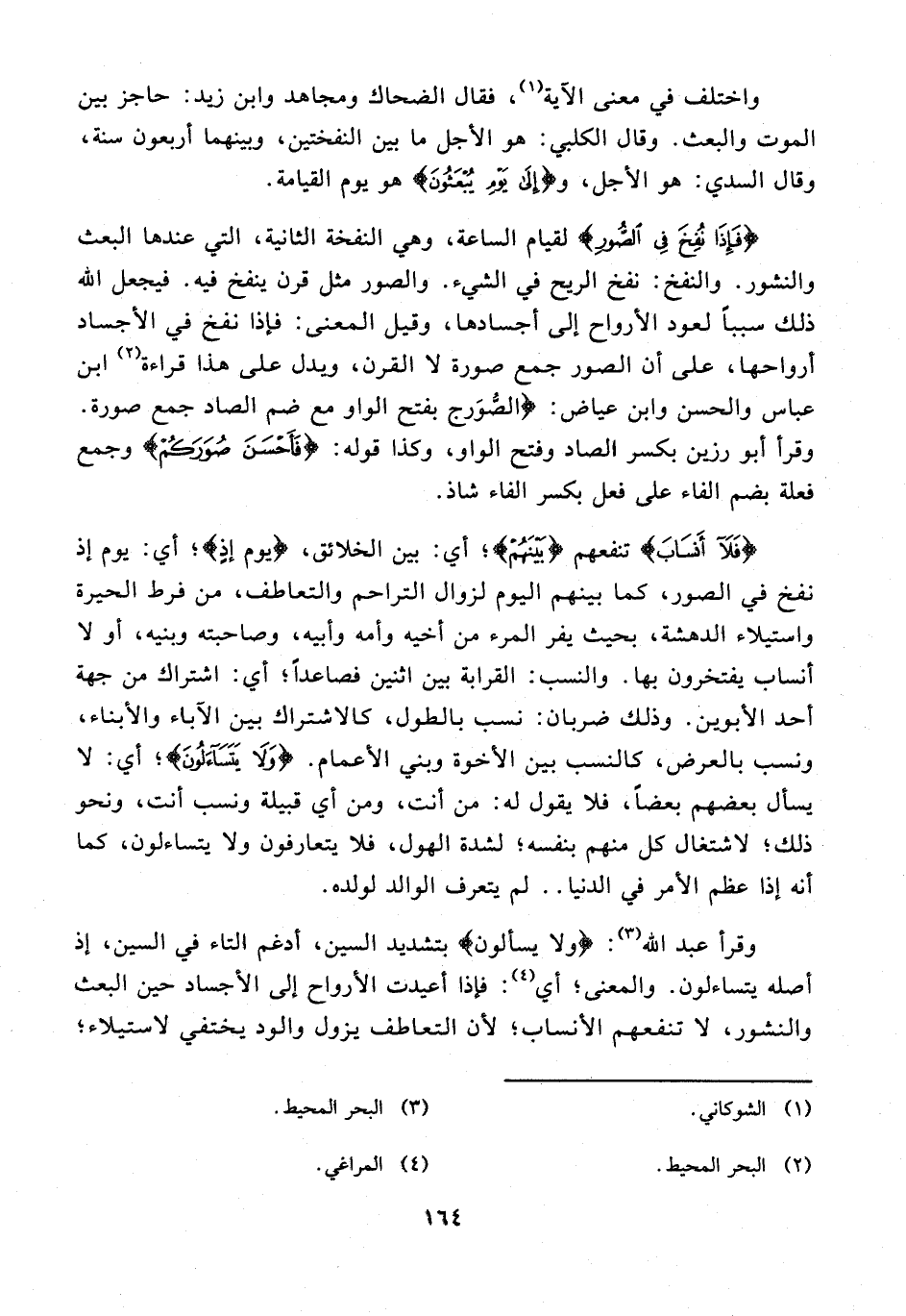وقرأ عبد الله (¬3): {ولا يسألون} بتشديد السين، أدغم التاء فى السين، إذ أصله يتساءلون. والمعنى؛ أى (¬4): فإذا أَعيدت الأرواح إلى الأجساد حين البعث والنشور، لا تنفعهم الأنساب؛ لأن التعاطف يزول والود يختفي لاستيلاء؛