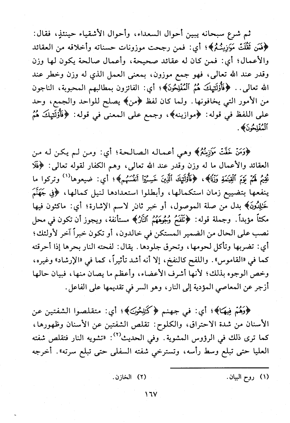 102 - ثم شرع سبحانه يبين أحوال السعداء، وأحوال الأشقياء حينئذٍ، فقال: {فَمَنْ ثَقُلَتْ مَوَازِينُهُ}؛ أي: فمن رجحت موزونات حسناته وأخلاقه من العقائد والأعمال؛ أي: فمن كان له عقائد صحيحة، وأعمال صالحة يكون لها وزن وقدر عند الله تعالى، فهو جمع موزون، بمعنى العمل الذي له وزن وخطر عند الله تعالى .. {فَأُولَئِكَ هُمُ الْمُفْلِحُونَ}؛ أي: الفائزون بمطالبهم المحبوبة، الناجون من الأمور التي يخافونها. ولما كان لفظ {من} يصلح للواحد والجمع، وحد على اللفظ فى قوله: {موازينه}، وجمع على المعنى فى قوله: {فَأُولَئِكَ هُمُ الْمُفْلِحُونَ}.