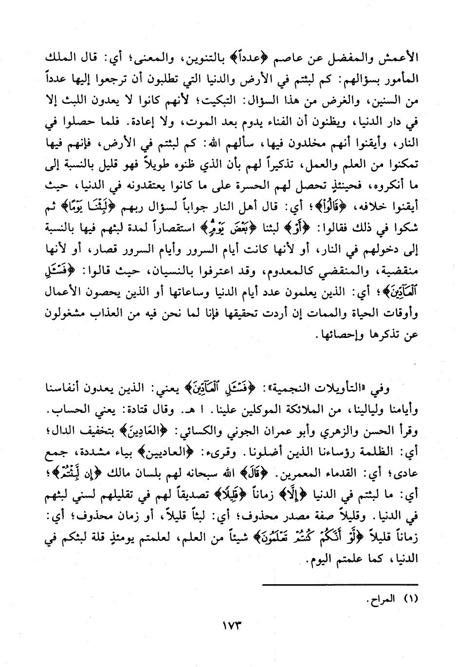 وفي "التأويلات النجمية": {فَاسْأَلِ الْعَادِّينَ} يعني: الذين يعدون أنفاسنا وأيامنا وليالينا، من الملائكة الموكلين علينا. اهـ. وقال قتادة: يعني الحساب. وقرأ الحسن والزهري وأبو عمران الجوني والكسائي: {الْعَادِّينَ} بتخفيف الدال؛ أي: الظلمة رؤساءنا الذين أضلونا. وقرىء: {العاديين} بياء مشددة، جمع عادى؛ أي: القدماء المعمرين.