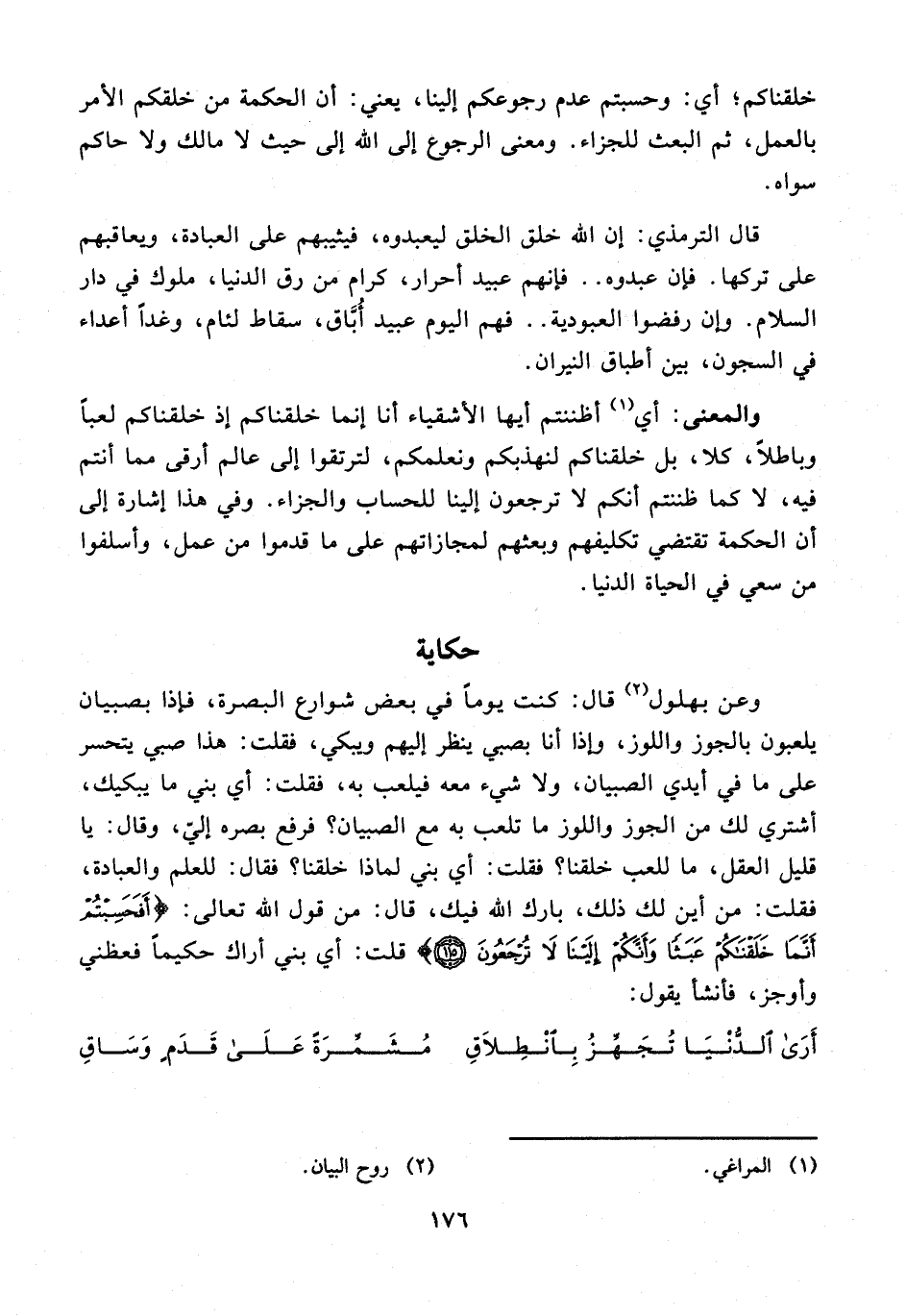 وعن بهلول (¬2) قال: كنت يومًا فى بعض شوارع البصرة، فإذا بصبيان يلعبون بالجوز واللوز، وإذا أنا بصبي ينظر إليهم ويبكي، فقلت: هذا صبي يتحسر على ما فى أيدي الصبيان، ولا شيء معه فيلعب به، فقلت: أي بني ما يبكيك، أشتري لك من الجوز واللوز ما تلعب به مع الصبيان؛ فرفع بصره إليّ، وقال: يا قليل العقل، ما للعب خلقنا؟ فقلت: أي بني لماذا خلقنا؟ فقال: للعلم والعبادة، ققلت: من أين لك ذلك، بارك الله فيك، قال: من قول الله تعالى: {أَفَحَسِبْتُمْ أَنَّمَا خَلَقْنَاكُمْ عَبَثًا وَأَنَّكُمْ إِلَيْنَا لَا تُرْجَعُونَ (115)} قلت: أي بني أراك حكيمًا فعظني وأوجز، فأنشا يقول: