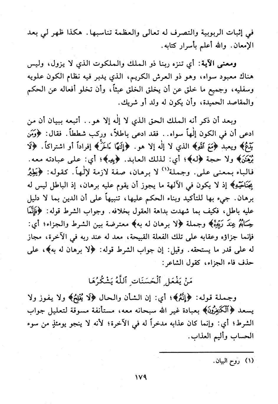 117 - وبعد أن ذكر أنه الملك الحق الذي لا إله إلا هو .. أتبعه ببيان أن من ادعى أن فى الكون إلهًا سواه .. فقد ادعى باطلًا، وركب شططًا. فقال: {وَمَنْ يَدْعُ} ويعبد {مَعَ اللَّهِ} الذي لا إله إلا هو. {إِلَهًا آخَر} إفرادًا أو اشتراكًا. {لَا بُرْهَان} ولا حجة {لَهُ}؛ أي: لذلك العابد. {بِهِ}؛ أي: على عبادته معه. فالباء بمعنى على. وجملة (¬1) لا برهان، صفة لازمة لإلهًا. كقوله: {يَطِيرُ بِجَنَاحَيْهِ} إذ لا يكون فى الآلهة ما يجوز أن يقوم عليه برهان، إذ الباطل ليس له برهان. جيء بها للتأكيد وبناء الحكم عليها، تنبيهًا على أن الدين بما لا دليل عليه باطل، فكيف بما شهدت بداهة العقول بخلافه. وجواب الشرط قوله: {فَإِنَّمَا حِسَابُهُ عِنْدَ رَبِّهِ} وجملة إلا برهان له به معترضة بين الشرط والجزاء؛ أي: فإنما جزاؤه وعقابه على تلك الفعلة القبيحة، معد له عند ربه فى الآخرة، مجاز له على قدر ما يستحقه. وقيل: إن جواب الشرط قوله: {لَا بُرْهَانَ لَهُ بِهِ}، على حذف فاء الجزاء، كقول الشاعر: