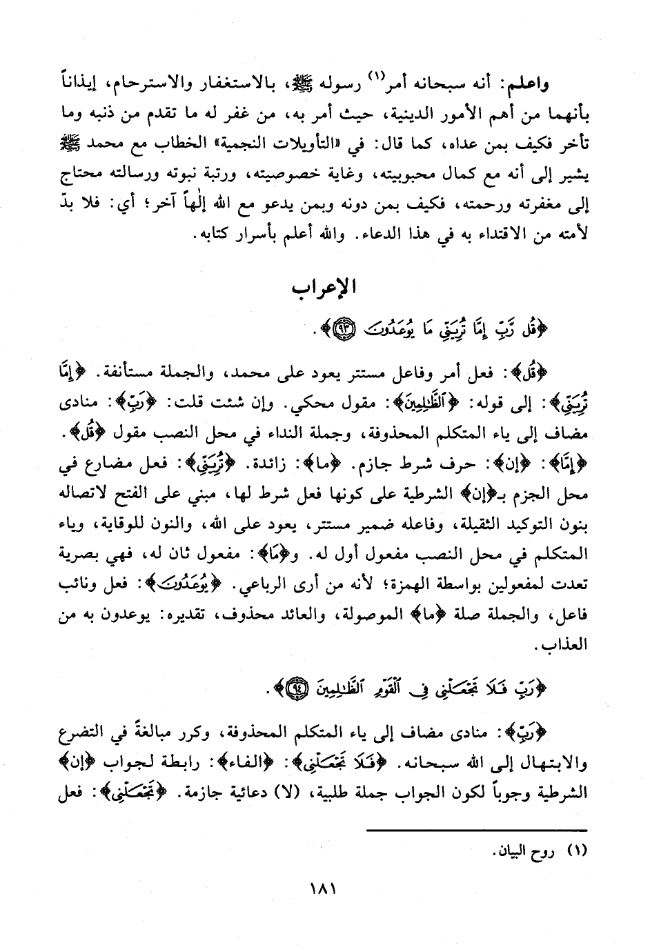 {قُلْ}: فعل أمر وفاعل مستتر يعود على محمَّد، والجملة مستأنفة. {إِمَّا تُرِيَنِّي}: إلى قوله: {الظَّالِمِينَ}: مقول محكي. وإن شئت قلت: {رَبِّ}: منادى مضاف إلى ياء المتكلم المحذوفة، وجملة النداء فى محل النصب مقول {قُلْ}. {إِمَّا}: {إن}: حرف شرط جازم. {ما}: زائدة. {تُرِيَنِّي}: فعل مضارع فى محل الجزم بـ {إن} الشرطية على كونها فعل شرط لها، مبني على الفتح لاتصاله بنون التوكيد الثقيلة، وفاعله ضمير مستتر، يعود على الله، والنون للوقاية، وياء المتكلم فى محل النصب مفعول أول له. و {مَا}: مفعول ثان له، فهي بصرية تعدت لمفعولين بواسطة الهمزة؛ لأنه من أرى الرباعي. {يُوعَدُونَ}: فعل ونائب فاعل، والجملة صلة {ما} الموصولة، والعائد محذوف، تقديره: يوعدون به من العذاب.