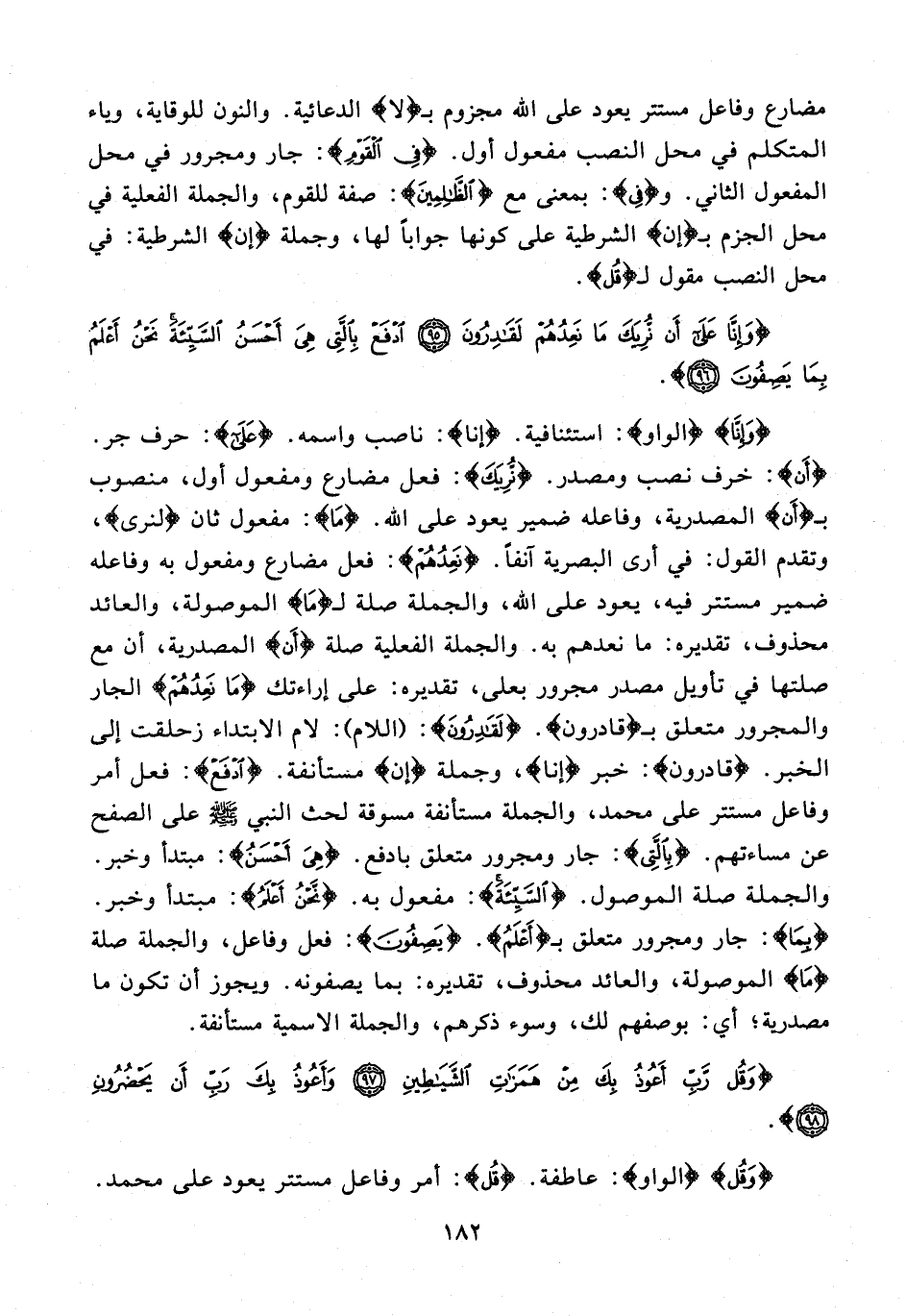 {وَإِنَّا} {الواو}: استئنافية. {إنا}: ناصب واسمه. {عَلَى}: حرف جر. {أَنْ}: حرف نصب ومصدر. {نُرِيَكَ}: فعل مضارع ومفعول أول، منصوب بـ {أَن} المصدرية، وفاعله ضمير يعود على الله. {مَا}: مفعول ثان {لنرى}، وتقدم القول: فى أرى البصرية آنفًا. {نَعِدُهُمْ}: فعل مضارع ومفعول به وفاعله ضمير مستتر فيه، يعود على الله، والجملة صلة لـ {مَا} الموصولة، والعائد محذوف، تقديره: ما نعدهم به. والجملة الفعلية صلة {أَن} المصدرية، أن مع صلتها فى تأويل مصدر مجرور بعلى، تقديره: على إراءتك {مَا نَعِدُهُمْ} الجار والمجرور متعلق بـ {قادرون}. {لَقَادِرُونَ}: {اللام}: لام الابتداء زحلقت إلى الخبر. {قادرون}: خبر {إنا}، وجملة {إن} مستأنفة. {ادْفَعْ}: فعل أمر وفاعل مستتر على محمَّد، والجملة مستأنفة مسوقة لحث النبي - صلى الله عليه وسلم - على الصفح عن مساءتهم. {بِالَّتِي}: جار ومجرور متعلق بادفع. {هِيَ أَحْسَنُ}: مبتدأ وخبر. والجملة صلة الموصول. {السَّيِّئَةَ}: مفعول به. {نَحْنُ أَعْلَمُ}: مبتدأ وخبر. {بِمَا}: جار ومجرور متعلق بـ {أَعْلَمُ}. {يَصِفُونَ}: فعل وفاعل، والجملة صلة {مَا} الموصولة، والعائد محذوف، تقديره: بما يصفونه. ويجوز أن تكون ما مصدرية؛ أي: بوصفهم لك، وسوء ذكرهم، والجملة الاسمية مستأنفة.