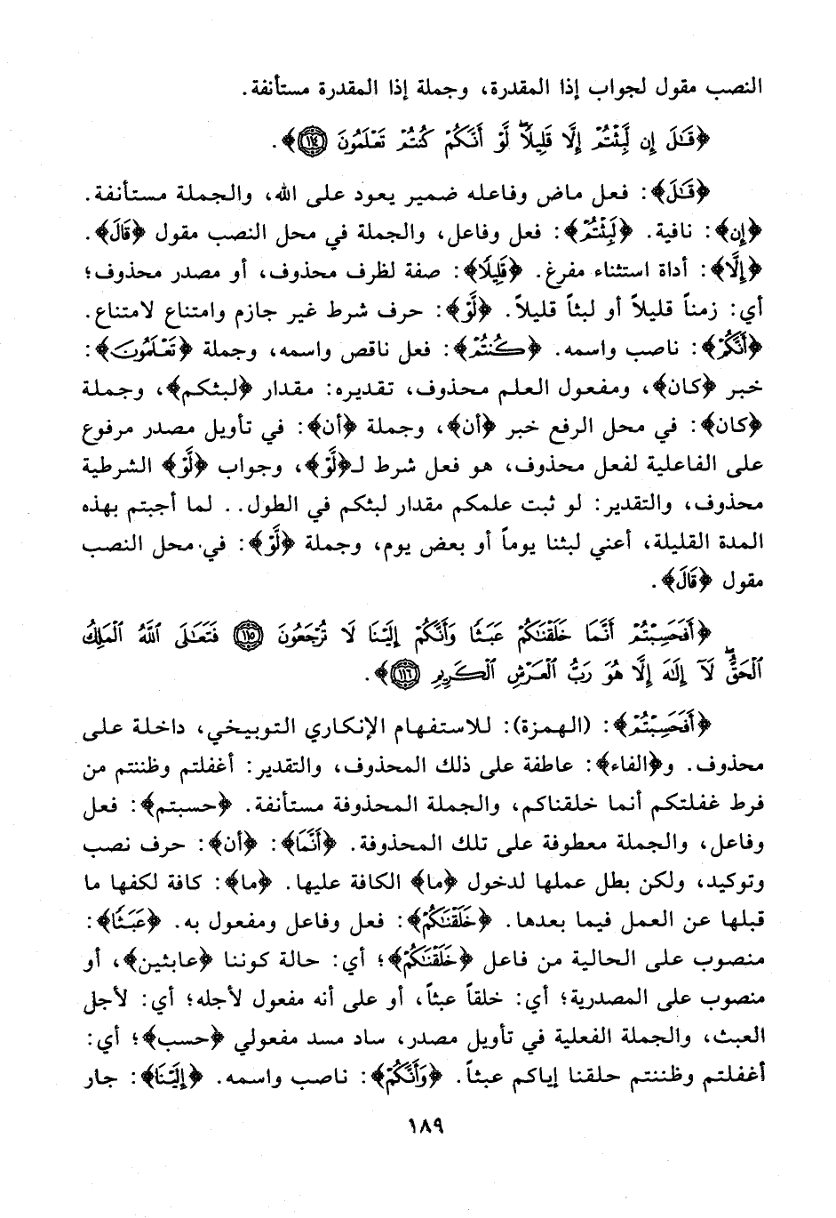 {أَفَحَسِبْتُمْ}: (الهمزة): للاستفهام الإنكاري التوبيخي، داخلة على محذوف. و {الفاء}: عاطفة على ذلك المحذوف، والتقدير: أغفلتم وظننتم من فرط غفلتكم أنما خلقناكم، والجملة المحذوفة مستأنفة. {حسبتم}: فعل وفاعل، والجملة معطوفة على تلك المحذوفة. {أَنَّمَا}: {أن}: حرف نصب وتوكيد، ولكن بطل عملها لدخول {ما} الكافة عليها. {ما}: كافة لكفها ما قبلها عن العمل فيما بعدها. {خَلَقْنَاكُمْ}: فعل وفاعل ومفعول به. {عَبَثًا}: منصوب على الحالية من فاعل {خَلَقْنَاكُمْ}؛ أي: حالة كوننا {عابثين}، أو منصوب على المصدرية؛ أي: خلقًا عبثًا، أو على أنه مفعول لأجله؛ أي: لأجل العبث، والجملة الفعلية فى تأويل مصدر، ساد مسد مفعولي {حسب}؛ أي: أغفلتص وظننتم حلقنا إياكم عبثًا. {وَأَنَّكُمْ}: ناصب واسمه {إِلَيْنَا}: جار