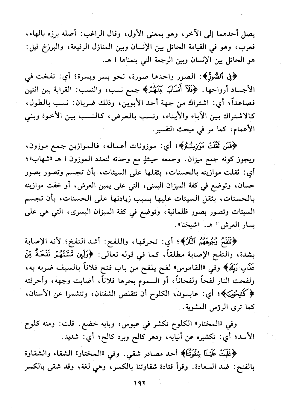 {فِي الصُّور}: الصور واحدها صورة، نحو بسر وبسرة؛ أي: نفخت فى الأجساد أرواحها. {فَلَا أَنْسَابَ بَيْنَهُمْ} جمع نسب، والنسب: القرابة بين اثنين فصاعدًا؛ أي: اشتراك من جهة أحد الأبوين، وذلك ضربان: نسب بالطول، كالاشتراك بين الآباء والأبناء، ونسب بالعرض، كالنسب بين الأخوة وبني الأعمام، كما مر فى مبحث التفسير.