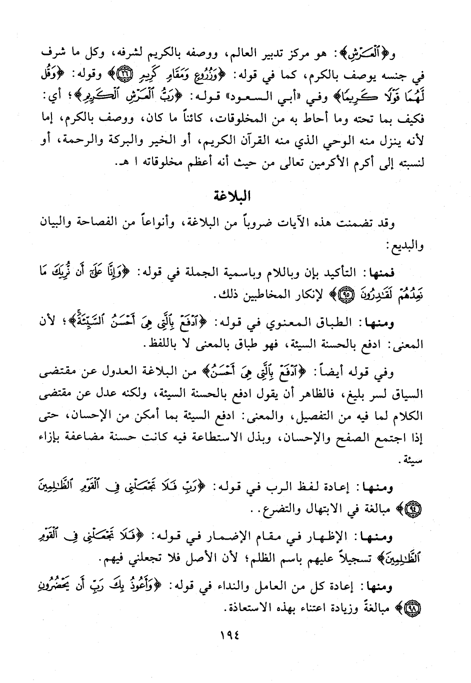 وفي قوله أيضًا: {ادْفَعْ بِالَّتِي هِيَ أَحْسَنُ} من البلاغة العدول عن مقتضى السياق لسر بليغ، فالظاهر أن يقول ادفع بالحسنة السيئة، ولكنه عدل عن مقتضى الكلام لما فيه من التفصيل، والمعنى: ادفع السيئة بما أمكن من الإحسان، حتى إذا اجتمع الصفح والإحسان, وبذل الاستطاعة فيه كانت حسنة مضاعفة بإزاء سيئة.