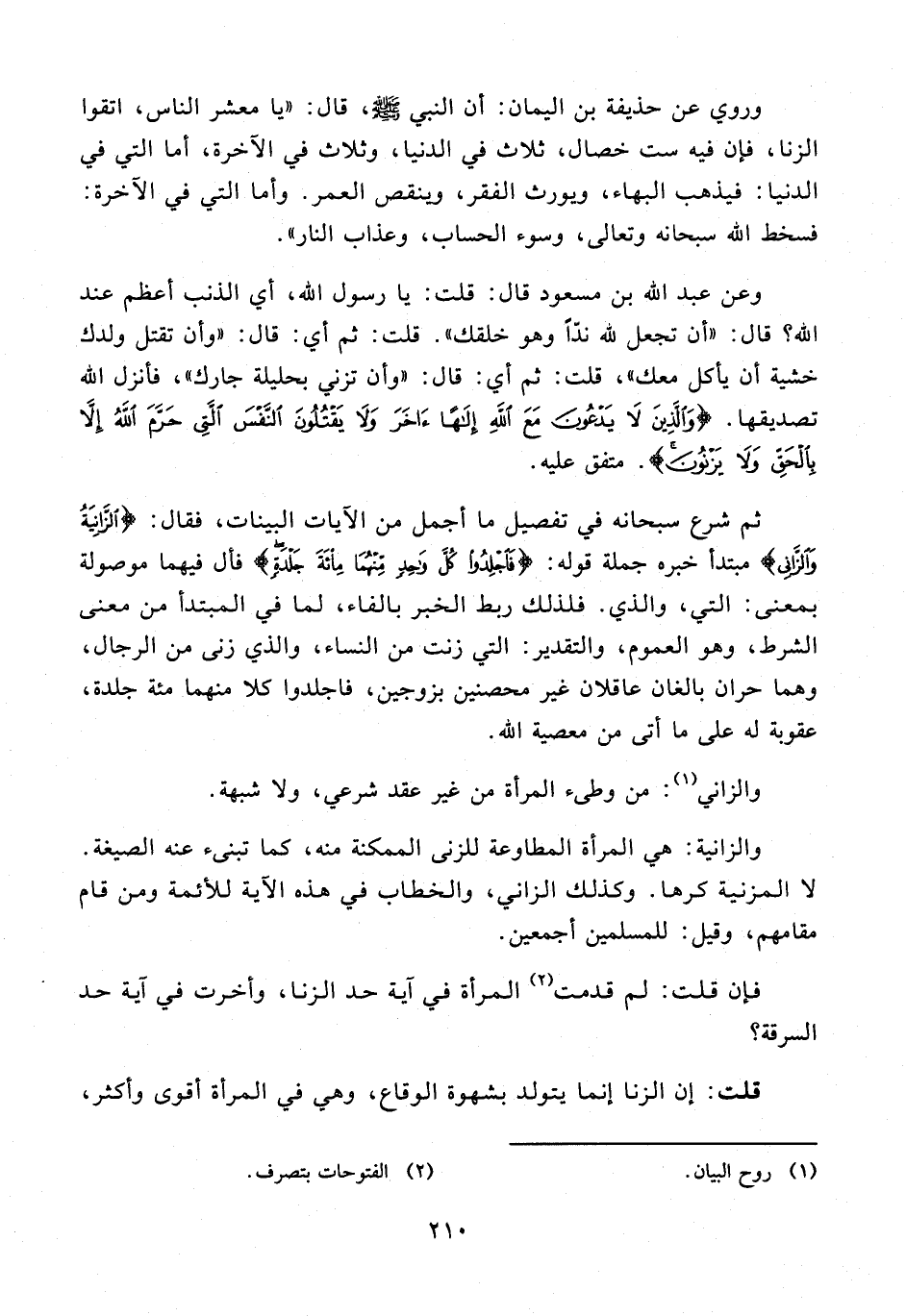 وعن عبد الله بن مسعود قال: قلت: يا رسول الله، أي الذنب أعظم عند الله؛ قال: "أن تجعل لله ندًّا وهو خلقك". قلت: ثم أي: قال: "وأن تقتل ولدك خشية أن يأكل معك"، قلت: ثم أي: قال: "وأن تزني بحليلة جارك"، فأنزل الله تصديقها. {وَالَّذِينَ لَا يَدْعُونَ مَعَ اللَّهِ إِلَهًا آخَرَ وَلَا يَقْتُلُونَ النَّفْسَ الَّتِي حَرَّمَ اللَّهُ إِلَّا بِالْحَقِّ وَلَا يَزْنُونَ}. متفق عليه.