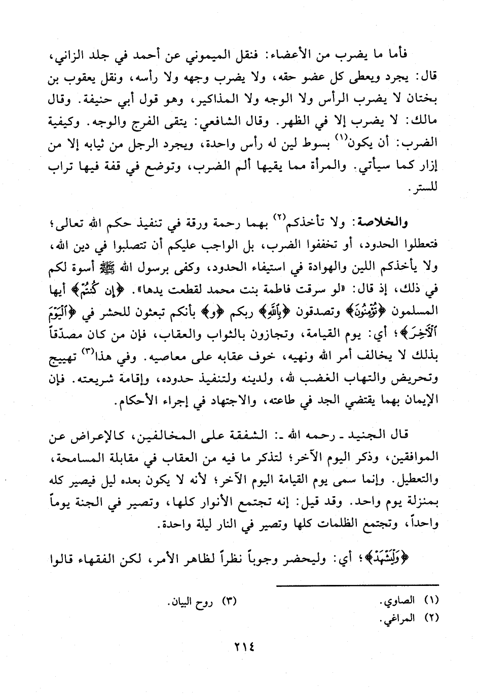 والخلاصة: ولا تأخذكم (¬2) بهما رحمة ورقة في تنفيذ حكم الله تعالى؛ فتعطلوا الحدود، أو تخففوا الضرب، بل الواجب عليكم أن تتصلبوا في دين الله، ولا يأخذكم اللين والهوادة في استيفاء الحدود، وكفى برسول الله - صلى الله عليه وسلم - أسوة لكم في ذلك، إذ قال: "لو سرقت فاطمة بنت محمد لقطعت يدها". {إِنْ كُنْتُمْ} أيها المسلمون {تُؤْمِنُونَ} وتصدقون {بِاللَّهِ} ربكم {و} بأنكم تبعثون للحشر في {وَالْيَوْمِ الْآخِرِ}؛ أي: يوم القيامة، وتجازون بالثواب والعقاب، فإن من كان مصدّقًا بذلك لا يخالف أمر الله ونهيه، خوف عقابه على معاصيه. وفي هذا (¬3) تهييج وتحريض والتهاب الغضب لله، ولدينه ولتنفيذ حدوده، وإقامة شريعته. فإن الإيمان بهما يقتضي الجد في طاعته، والاجتهاد في إجراء الأحكام.