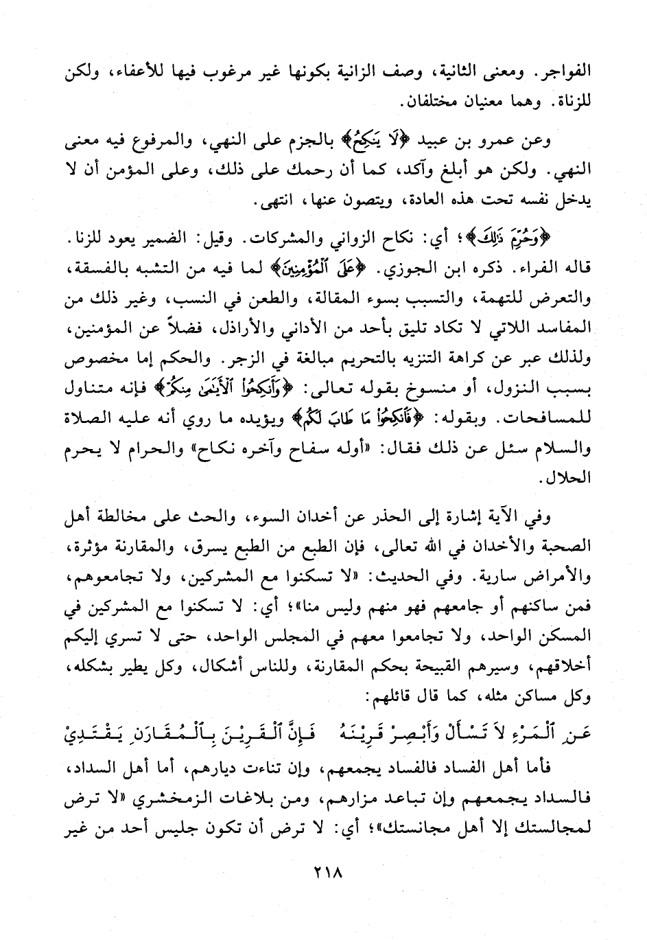 الفواجر. ومعنى الثانية، وصف الزانية بكونها غير مرغوب فيها للأعفاء، ولكن للزناة. وهما معنيان مختلفان.