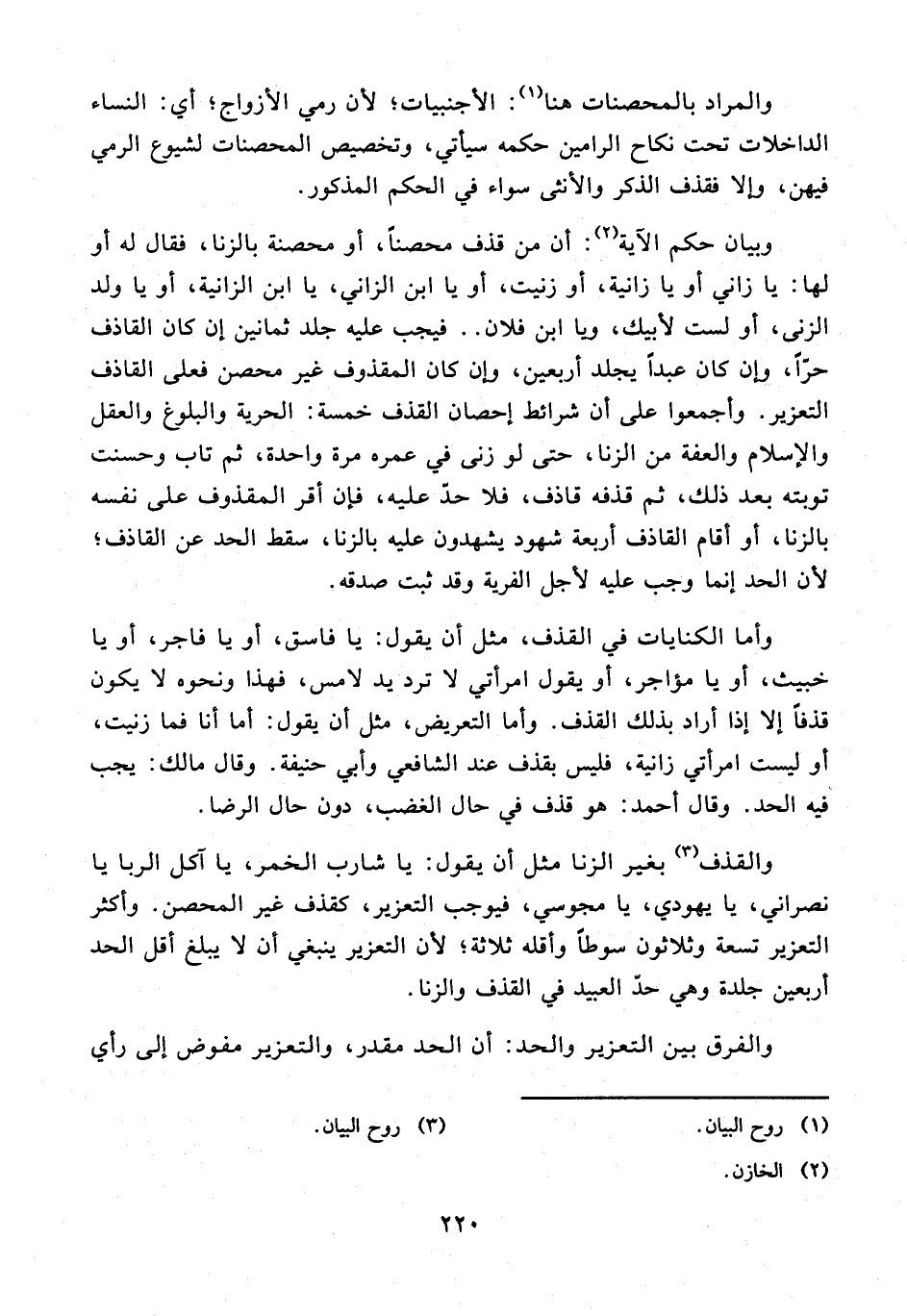 وبيان حكم الآية (¬2): أن من قذف محصنًا، أو محصنة بالزنا، فقال له أو لها: يا زاني أو يا زانية، أو زنيت، أو يا ابن الزاني، يا ابن الزانية، أو يا ولد الزنى، أو لست لأبيك، ويا ابن فلان .. فيجب عليه جلد ثمانين إن كان القاذف حرًا، وإن كان عبدًا يجلد أربعين، وإن كان المقذوف غير محصن فعلى القاذف التعزير. وأجمعوا على أن شرائط إحصان القذف خمسة: الحرية والبلوغ والعقل والإِسلام والعفة من الزنا، حتى لو زنى في عمره مرة واحدة، ثم تاب وحسنت توبته بعد ذلك، ثم قذفه قاذف، فلا حدّ عليه، فإن أقر المقذوف على نفسه بالزنا، أو أقام القاذف أربعة شهود يشهدون عليه بالزنا، سقط الحد عن القاذف؛ لأن الحد إنما وجب عليه لأجل الفرية وقد ثبت صدقه.