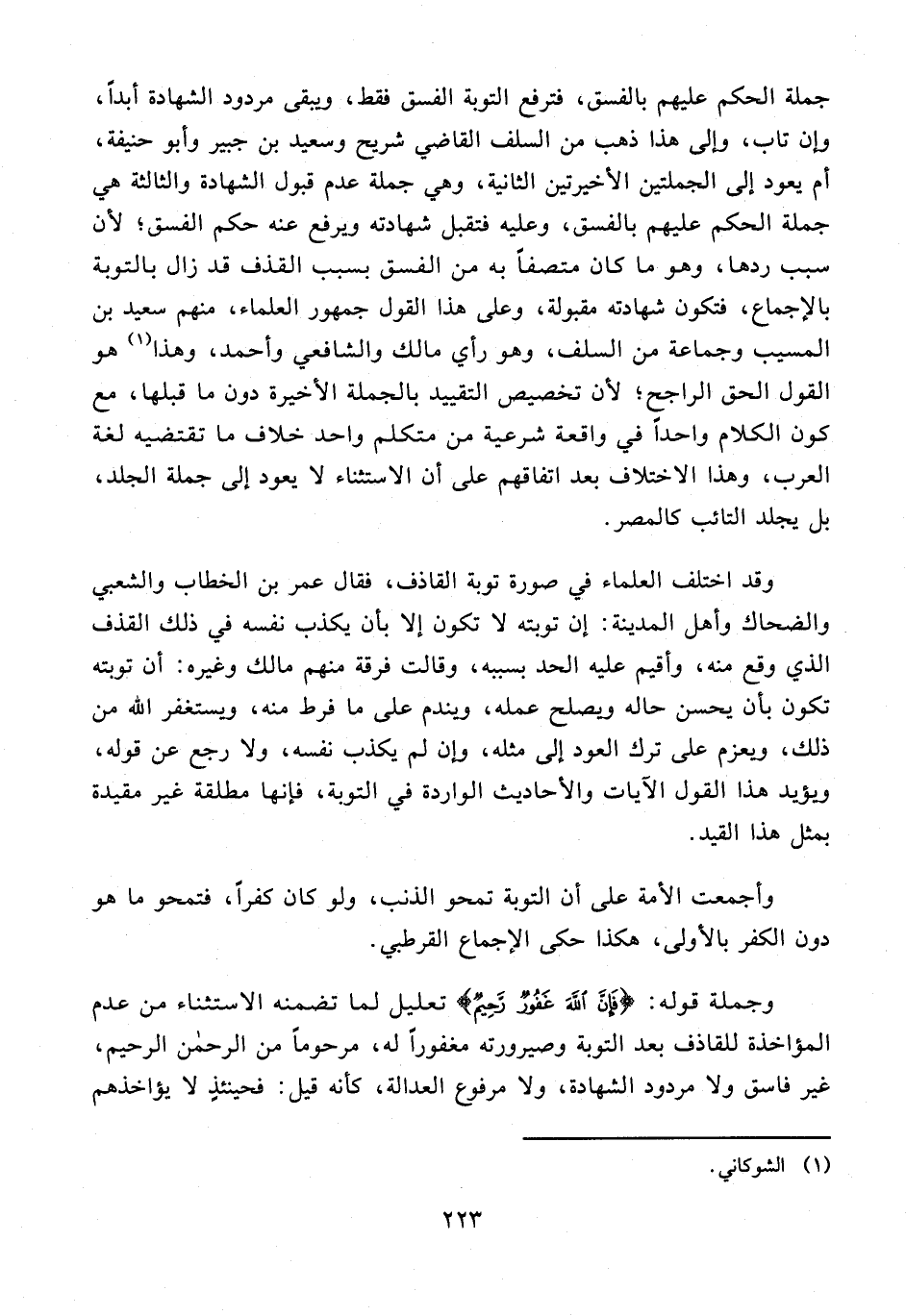 جملة الحكم عليهم بالفسق، فترفع التوبة الفسق فقط، ويبقى مردود الشهادة أبدًا، وإن تاب، وإلى هذا ذهب من السلف القاضي شريح وسعيد بن جبير وأبو حنيفة، أم يعود إلى الجملتين الأخيرتين الثانية، وهي جملة عدم قبول الشهادة والثالثة هي جملة الحكم عليهم بالفسق، وعليه فتقبل شهادته ويرفع عنه حكم الفسق؛ لأن سبب ردها، وهو ما كان متصفًا به من الفسق بسبب القذف قد زال بالتوبة بالإجماع، فتكون شهادته مقبولة، وعلى هذا القول جمهور العلماء، منهم سعيد بن المسيب وجماعة من السلف، وهو رأي مالك والشافعي وأحمد، وهذا (¬1) هو القول الحق الراجح؛ لأن تخصيص التقييد بالجملة الأخيرة دون ما قبلها، مع كون الكلام واحدًا في واقعة شرعية من متكلم واحد خلاف ما تقتضيه لغة العرب، وهذا الاختلاف بعد اتفاقهم على أن الاستثناء لا يعود إلى جملة الجلد، بل يجلد التائب كالمصر.