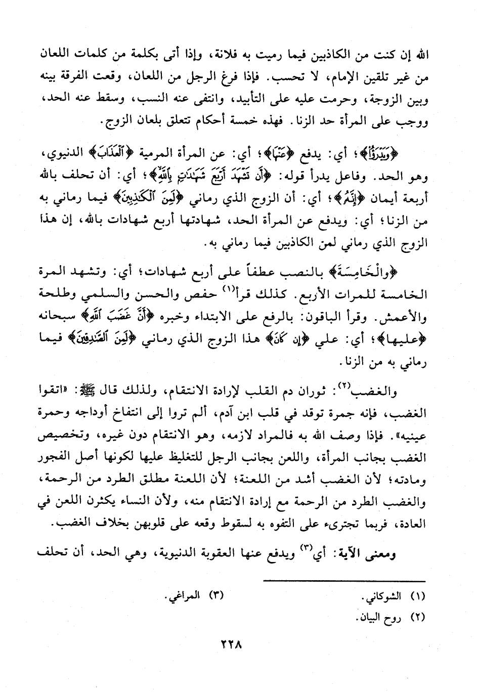 8 - {وَيَدْرَأُ}؛ أي: يدفع {عَنْهَا}؛ أي: عن المرأة المرمية {الْعَذَابَ} الدنيوي، وهو الحد. وفاعل يدرأ قوله: {أَنْ تَشْهَدَ أَرْبَعَ شَهَادَاتٍ}، أي: أن تحلف بالله أربعة أيمان {إِنَّهُ}؛ أي: أن الزوج الذي رماني {لَمِنَ الْكَاذِبِينَ} فيما رماني به من الزنا؛ أي: ويدفع عن المرأة الحد، شهادتها أربع شهادات بالله، إن هذا الزوج الذي رماني لمن الكاذبين فيما رماني به.