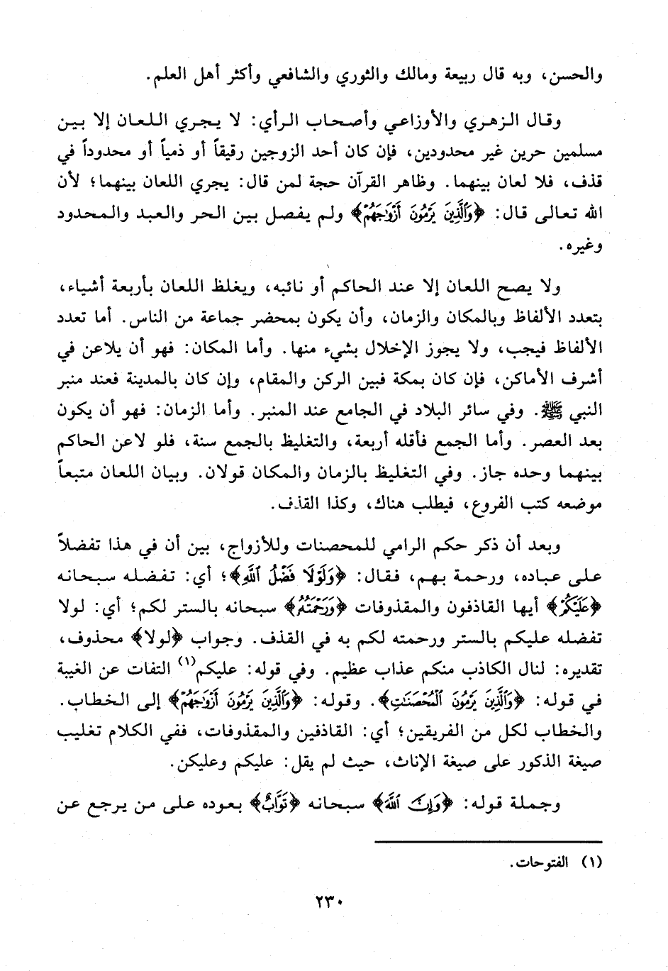 وقال الزهري والأوزاعي وأصحاب الرأي: لا يجري اللعان إلا بين مسلمين حرين غير محدودين، فإن كان أحد الزوجين رقيقًا أو ذميًا أو محدودًا في قذف، فلا لعان بينهما. وظاهر القرآن حجة لمن قال: يجري اللعان بينهما؛ لأن الله تعالى قال: {وَالَّذِينَ يَرْمُونَ أَزْوَاجَهُمْ} ولم يفصل بين الحر والعبد والمحدود وغيره.