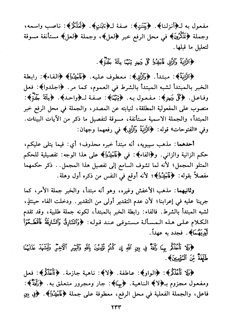 {الزَّانِيَةُ}: مبتدأ. {وَالزَّانِي}: معطوف عليه. {فَاجْلِدُوا} {الفاء}: رابطة الخبر بالمبتدأ لشبه المبتدأ بالشرط في العموم، كما مر. {اجلدوا}: فعل وفاعل. {كُلَّ وَاحِدٍ}: مفعول به. {مِنْهُمَا}: صفة لـ {واحد}. {مِائَةَ جَلْدَةٍ}: منصوب على المفعولية المطلقة، لنيابته عن المصدر، والجملة في محل الرفع خبر المبتدأ، والجملة الاسمية مستأنفة، مسوقة لتفصيل ما ذكر من الآيات البينات. وفي "الفتوحات" قوله: {الزَّانِيَةُ وَالزَّانِي} في رفعهما وجهان: