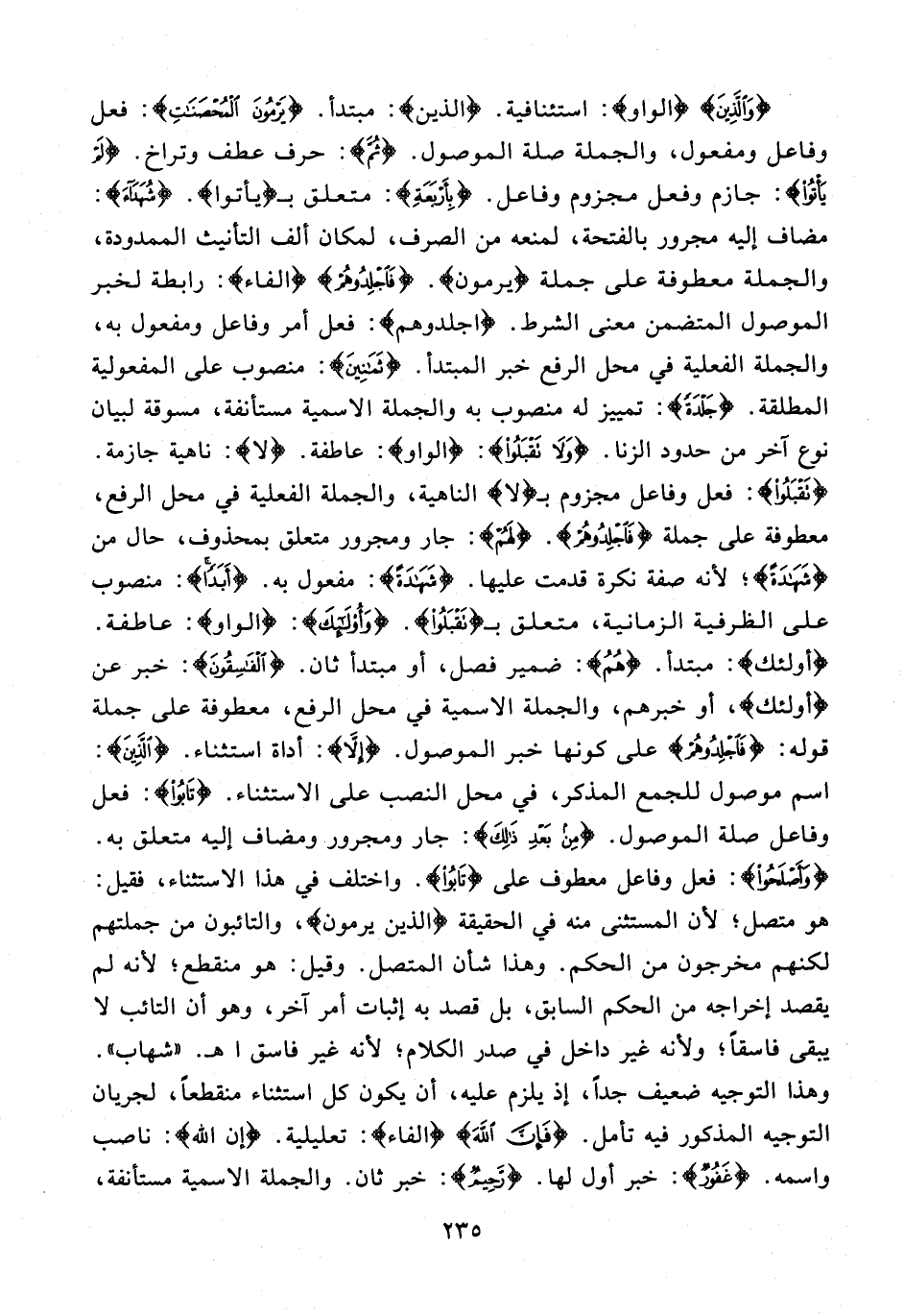 {وَالَّذِينَ} {الواو}: استئنافية. {الذين}: مبتدأ. {يَرْمُونَ الْمُحْصَنَاتِ}: فعل وفاعل ومفعول، والجملة صلة الموصول. {ثُمَّ}: حرف عطف وتراخ. {لَمْ يَأْتُوا}: جازم وفعل مجزوم وفاعل. {بِأَرْبَعَةِ}: متعلق بـ {يأتوا}. {شُهَدَاءَ}: مضاف إليه مجرور بالفتحة، لمنعه من الصرف، لمكان ألف التأنيث الممدودة، والجملة معطوفة على جملة {يرمون}. {فَاجْلِدُوهُمْ} {الفاء}: رابطة لخبر الموصول المتضمن معنى الشرط. {اجلدوهم}: فعل أمر وفاعل ومفعول به، والجملة الفعلية في محل الرفع خبر المبتدأ. {ثَمَانِينَ}: منصوب على المفعولية المطلقة. {جَلْدَةً}: تمييز له منصوب به والجملة الاسمية مستأنفة، مسوقة لبيان نوع آخر من حدود الزنا. {وَلَا تَقْبَلُوا}: {الواو}: عاطفة. {لا}: ناهية جازمة. {تَقْبَلُوا}: فعل وفاعل مجزوم بـ {لا} الناهية، والجملة الفعلية في محل الرفع، معطوفة على جملة {فَاجْلِدُوهُمْ}. {لَهُمْ}: جار ومجرور متعلق بمحذوف، حال من {شَهَادَةً}؛ لأنه صفة نكرة قدمت عليها. {شَهَادَةً} مفعول به. {أَبَدًا}: منصوب على الظرفية الزمانية، متعلق بـ {تَقْبَلُوا}. {وَأُولَئِكَ}: {الواو}: عاطفة. {أولئك}: مبتدأ. {هُمُ}: ضمير فصل، أو مبتدأ ثان. {الْفَاسِقُونَ}: خبر عن {أولئك}، أو خبرهم، والجملة الاسمية في محل الرفع، معطوفة على جملة قوله: {فَاجْلِدُوهُمْ} على كونها خبر الموصول. {إِلَّا}: أداة استثناء. {الَّذِينَ}: اسم موصول للجمع المذكر، في محل النصب على الاستثناء. {تَابُوا}: فعل وفاعل صلة الموصول. {مِنْ بَعْدِ ذَلِكَ}: جار ومجرور ومضاف إليه متعلق به. {وَأَصْلَحُوا}: فعل وفاعل معطوف على {تَابُوا}. واختلف في هذا الاستثناء، فقيل: هو متصل؛ لأن المستثنى منه في الحقيقة {الذين يرمون}، والتائبون من جملتهم لكنهم مخرجون من الحكم. وهذا شأن المتصل. وقيل: هو منقطع؛ لأنه لم يقصد إخراجه من الحكم السابق، بل قصد به إثبات أمر آخر، وهو أن التائب لا يبقى فاسقًا؛ ولأنه غير داخل في صدر الكلام؛ لأنه غير فاسق اهـ. "شهاب". وهذا التوجيه ضعيف جدًّا، إذ يلزم عليه، أن يكون كل استثناء منقطعًا، لجريان التوجيه المذكور فيه تأمل. {فَإِنَّ اللَّهَ} {الفاء}: تعليلية. {إن الله}: ناصب واسمه. {غَفُورٌ}: خبر أول لها. {رَحِيمٌ}: خبر ثان. والجملة الاسمية مستأنفة،