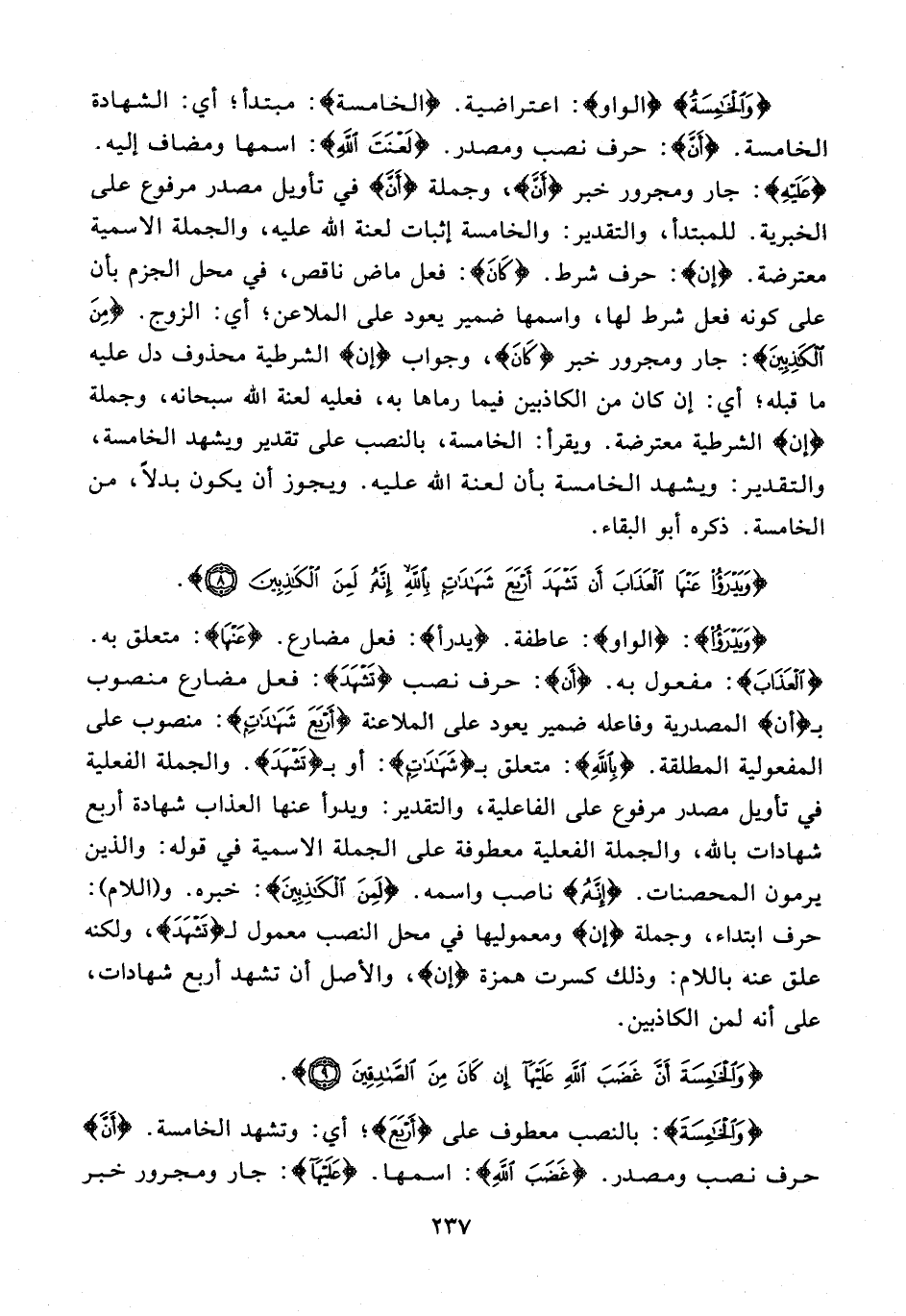 {وَالْخَامِسَةُ} {الواو}: اعتراضية. {الخامسة}: مبتدأ؛ أي: الشهادة الخامسة. {أَنَّ}: حرف نصب ومصدر. {لَعْنَتَ اللَّهِ}: اسمها ومضاف إليه. {عَلَيْهِ}: جار ومجرور خبر {أَنَّ}، وجملة {أَنَّ} في تأويل مصدر مرفوع على الخبرية. للمبتدأ، والتقدير: والخامسة إثبات لعنة الله عليه، والجملة الاسمية معترضة. {إن}: حرف شرط. {كَانَ}: فعل ماض ناقص، في محل الجزم بأن على كونه فعل شرط لها، واسمها ضمير يعود على الملاعن؛ أي: الزوج. {مِنَ الْكَاذِبِينَ}: جار ومجرور خبر {كَانَ}، وجواب {إن} الشرطية محذوف دل عليه ما قبله؛ أي: إن كان من الكاذبين فيما رماها به، فعليه لعنة الله سبحانه، وجملة {إن} الشرطية معترضة. ويقرأ: الخامسة، بالنصب على تقدير ويشهد الخامسة، والتقدير: ويشهد الخامسة بأن لعنة الله عليه. ويجوز أن يكون بدلًا، من الخامسة. ذكره أبو البقاء.