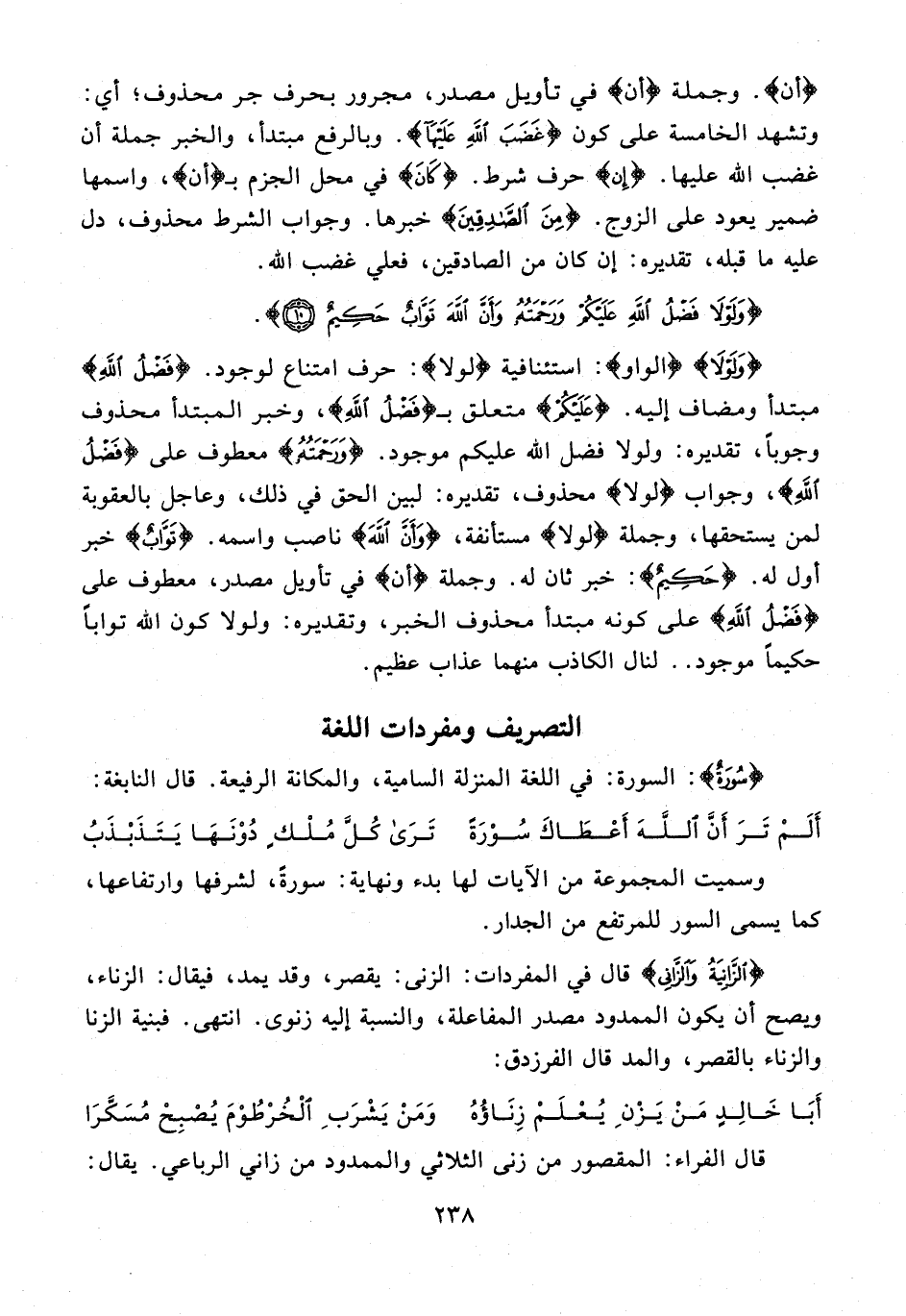 {أن}. وجملة {أن} في تأويل مصدر، مجرور بحرف جر محذوف؛ أي: وتشهد الخامسة على كون {غَضَبَ اللَّهِ عَلَيْهَا}. وبالرفع مبتدأ، والخبر جملة أن غضب الله عليها. {إِن} حرف شرط. {كَانَ} في محل الجزم بـ {أن}، واسمها ضمير يعود على الزوج. {مِنَ الصَّادِقِينَ} خبرها. وجواب الشرط محذوف، دل عليه ما قبله، تقديره: إن كان من الصادقين، فعلي غضب الله.